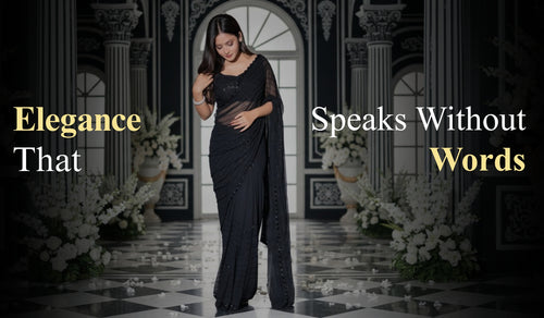 Turn heads with this bestselling classic black georgette saree, intricately hand-embellished with cutdana detailing in a geometric jaal design. The border is beautifully finished with...