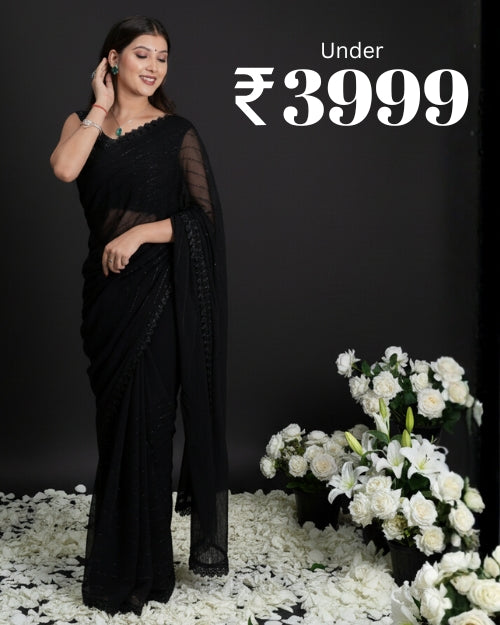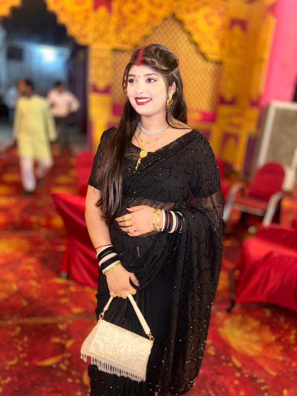 Turn heads with this bestselling classic black georgette saree, intricately hand-embellished with cutdana detailing in a geometric jaal design. The border is beautifully finished with...