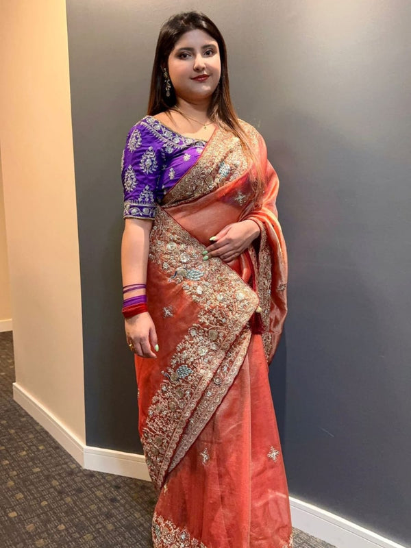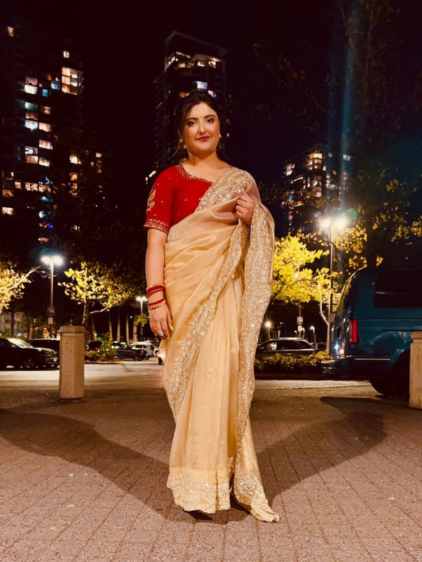 Crystal Tissue Saree with Pearl & Cutdana Handwork – Lightweight & Luxe Finish