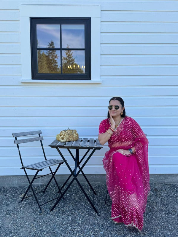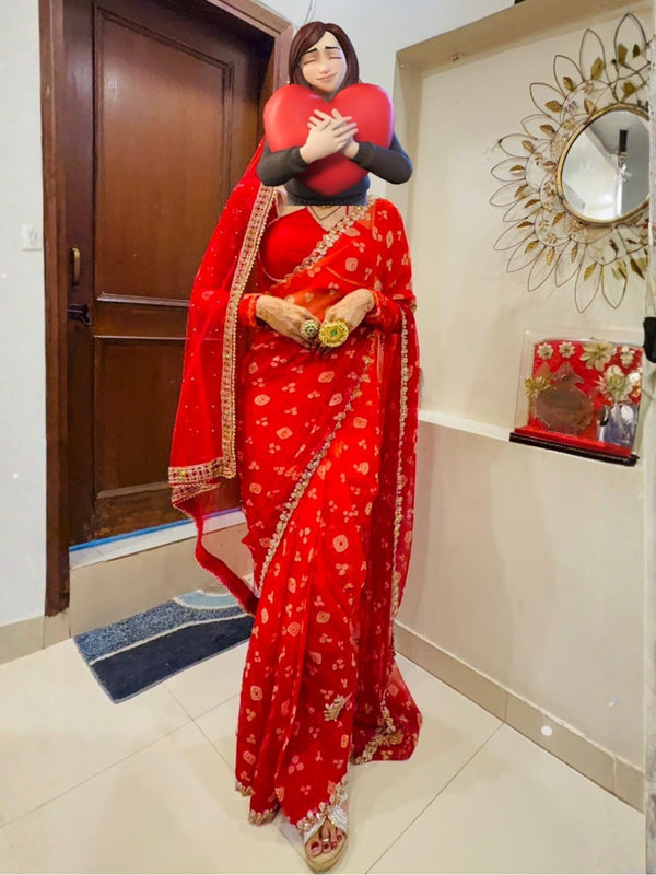 Pure Chinon Bandhani Saree with Scalloped Mirror & Gota Embroidery Border