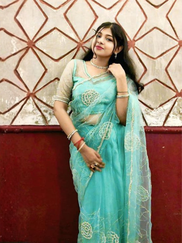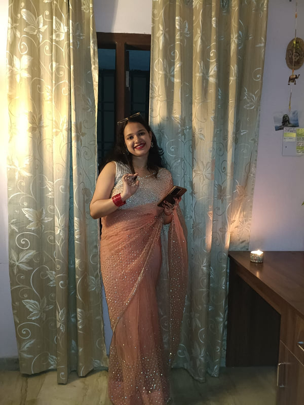 Net Saree with Heavy Sequin Floral Embroidery & Readymade Designer Blouse