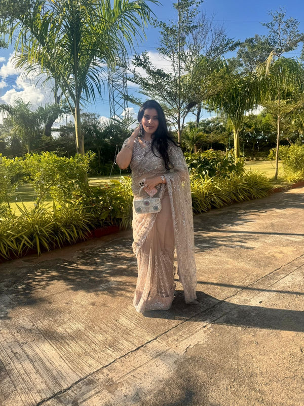 A dreamy drape for your most special moments 💫This Net Saree features exquisite multi-tone sequin, bead, and thread embroidery with intricate floral patterns across the...