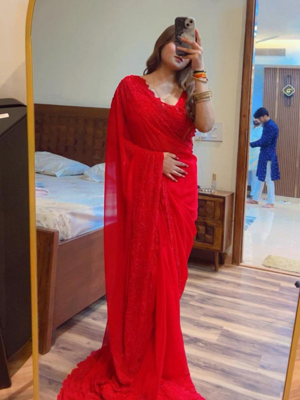 Shimmer Chiffon Saree with Floral Sequin Embroidery & Scalloped Border