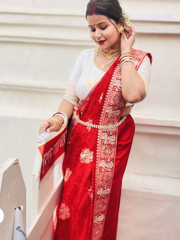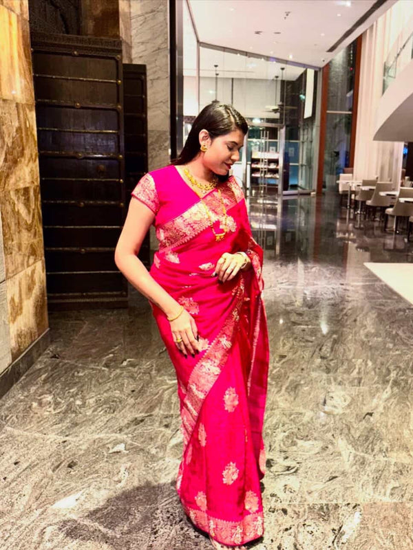 • Fabric: Premium Banarasi Silk — smooth texture with luxurious shine.• Work: Intricate zari weaving across the body with traditional motifs and geometric detailing.• Border:...