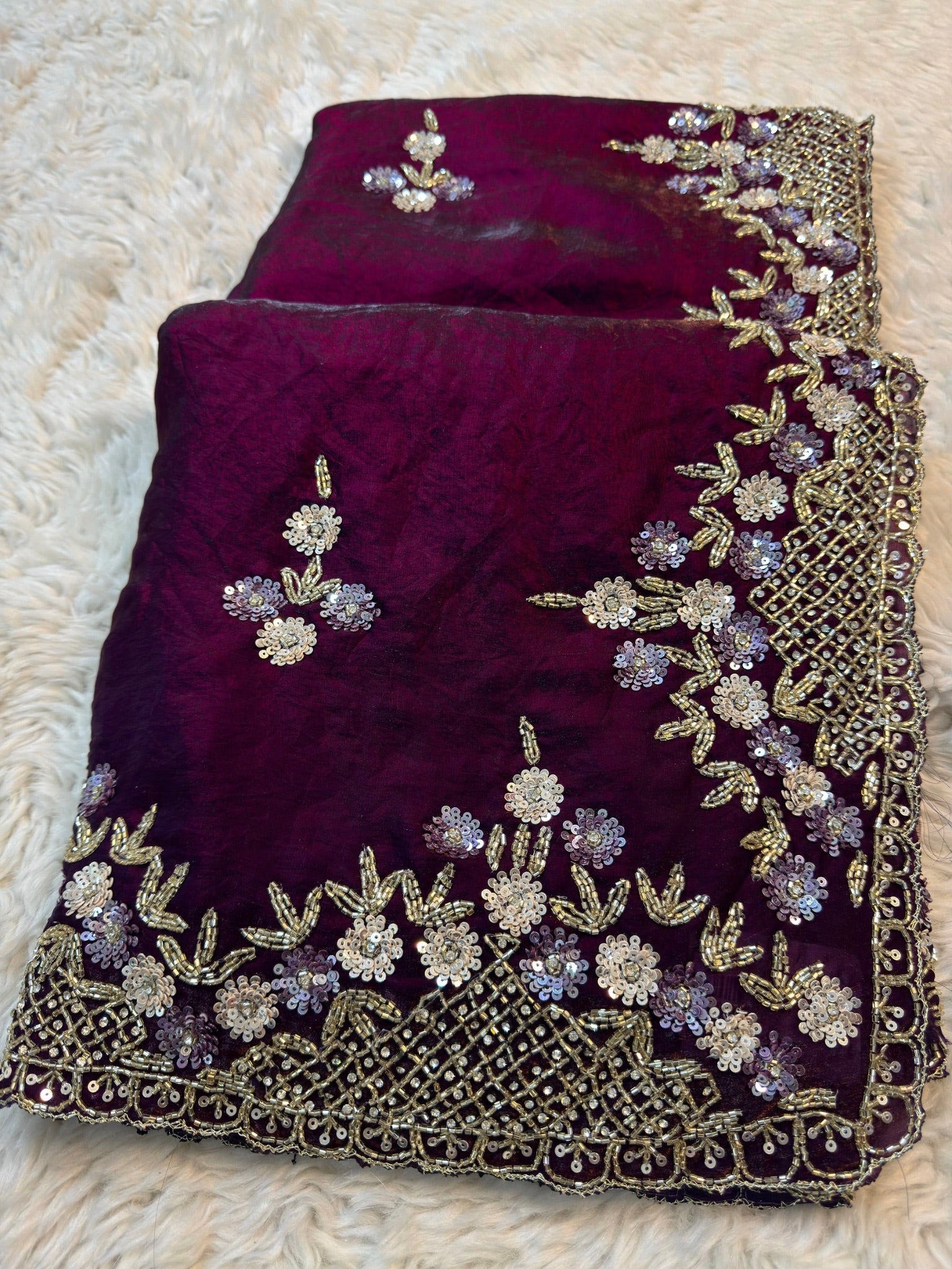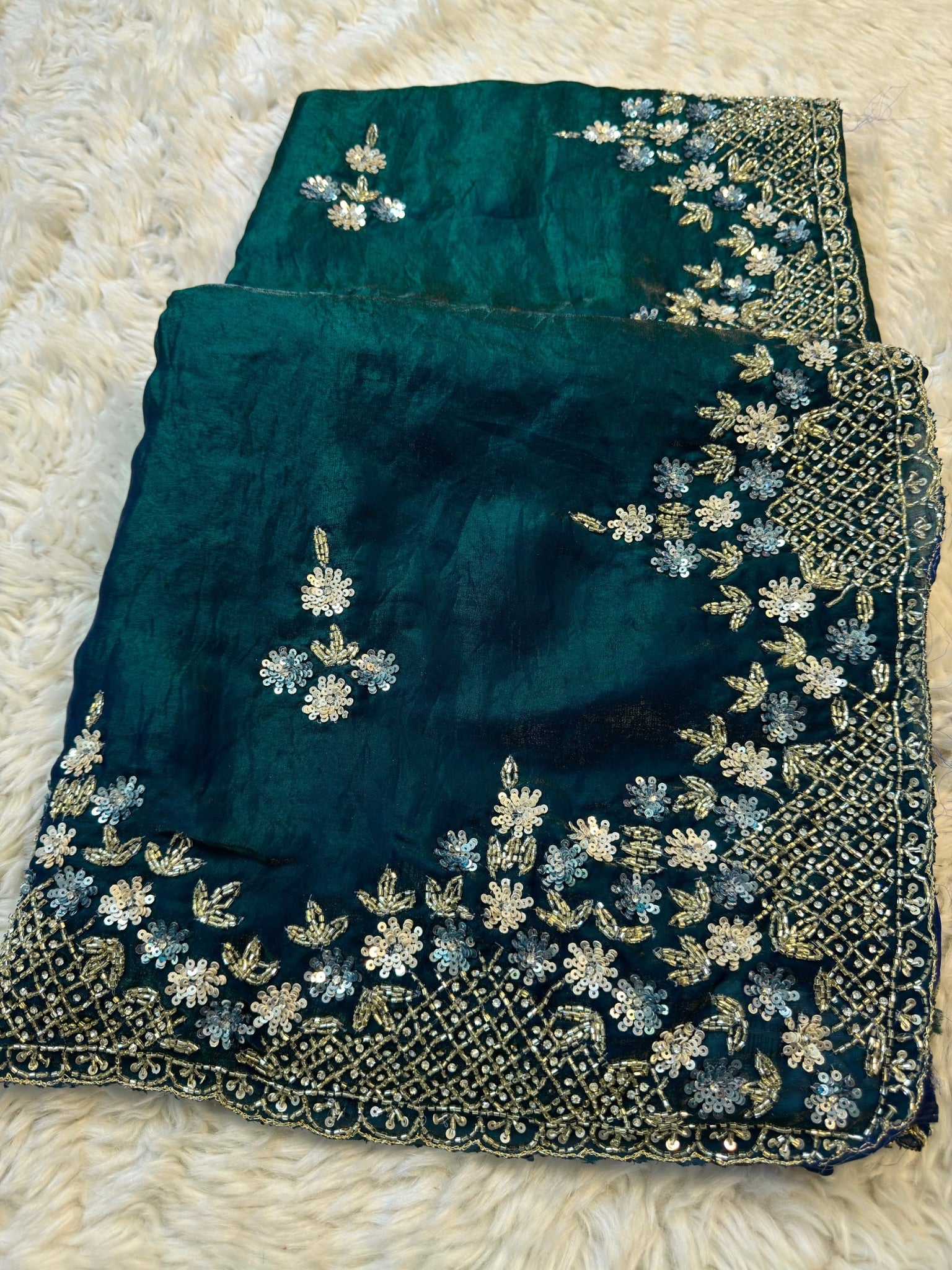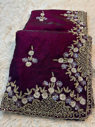 Fendy Silk Saree with Floral Sequin Embroidery and Heavy Beaded Border