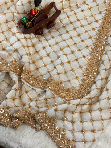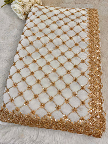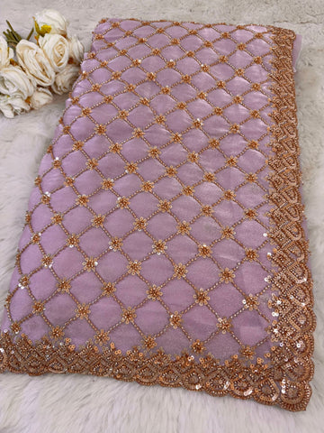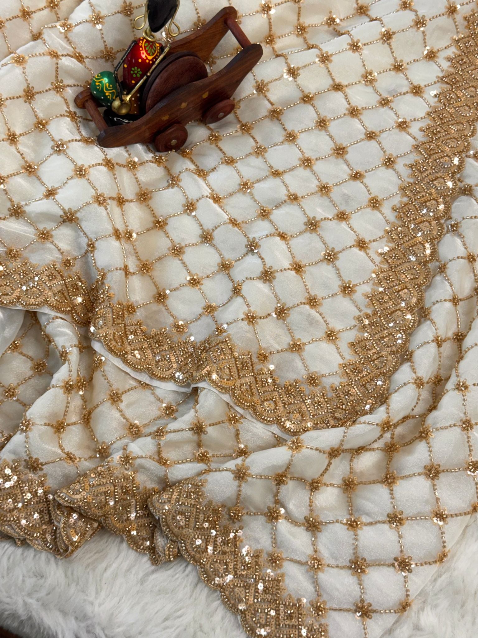 Crafted in luxurious Galaxy Silk fabric, this saree features an all-over diamond jaal pattern delicately handworked with beads and sequins. The border is highlighted with a scalloped beads & sequin design, making it a stunning choice for festive functions, weddings, and parties.