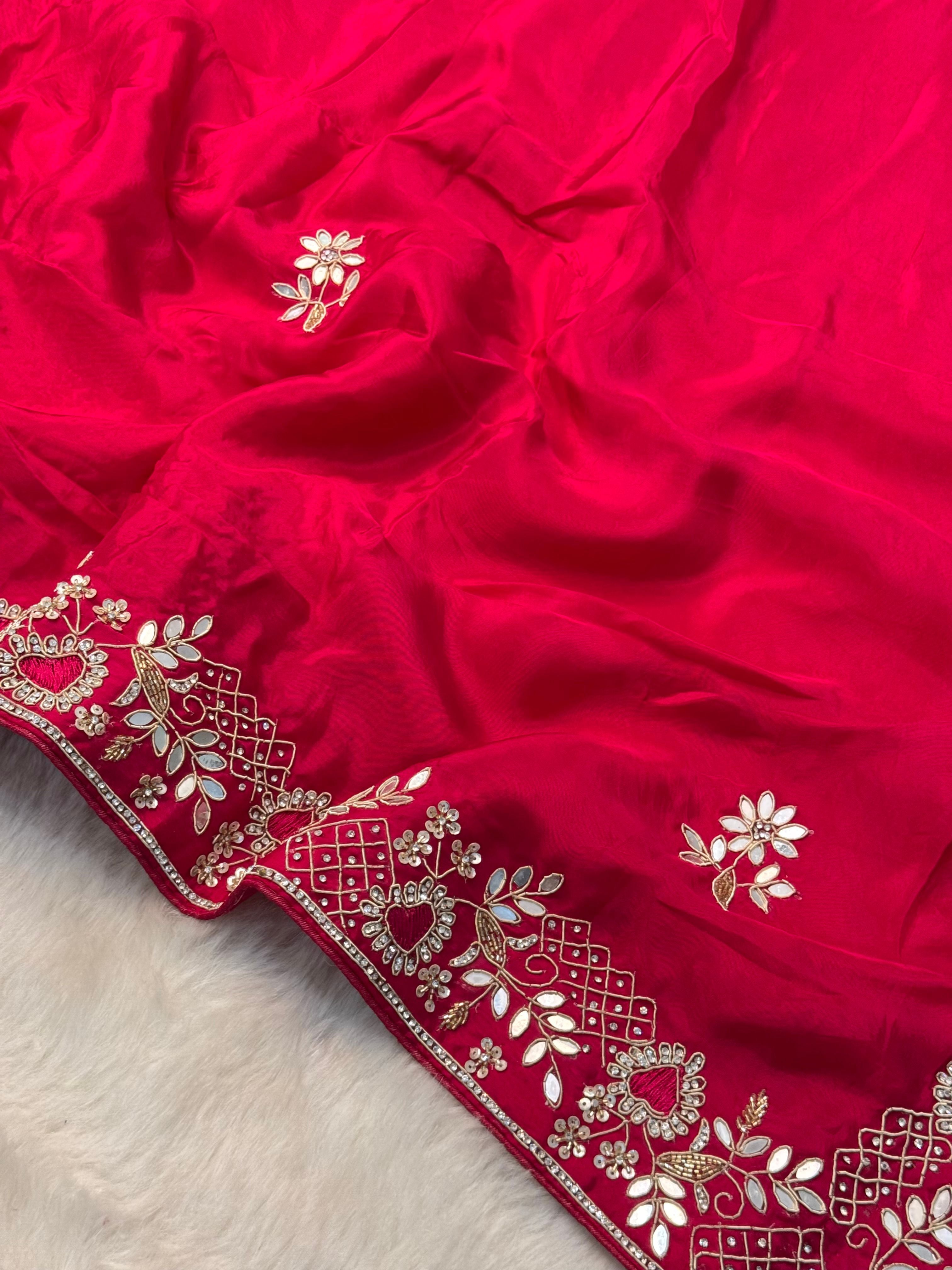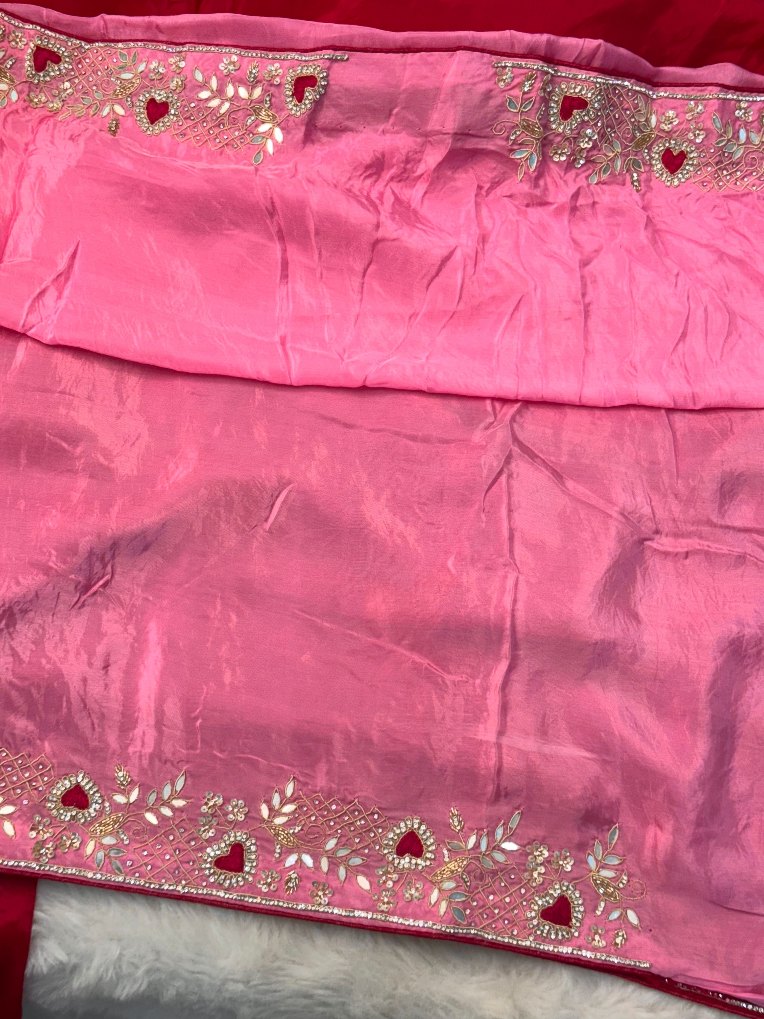 HO Silk saree featuring signature heart motifs with mirror & floral hand embroidery on the borders. Paired with a contrast designer blouse β€” perfect for festivals, gifting & elegant functions