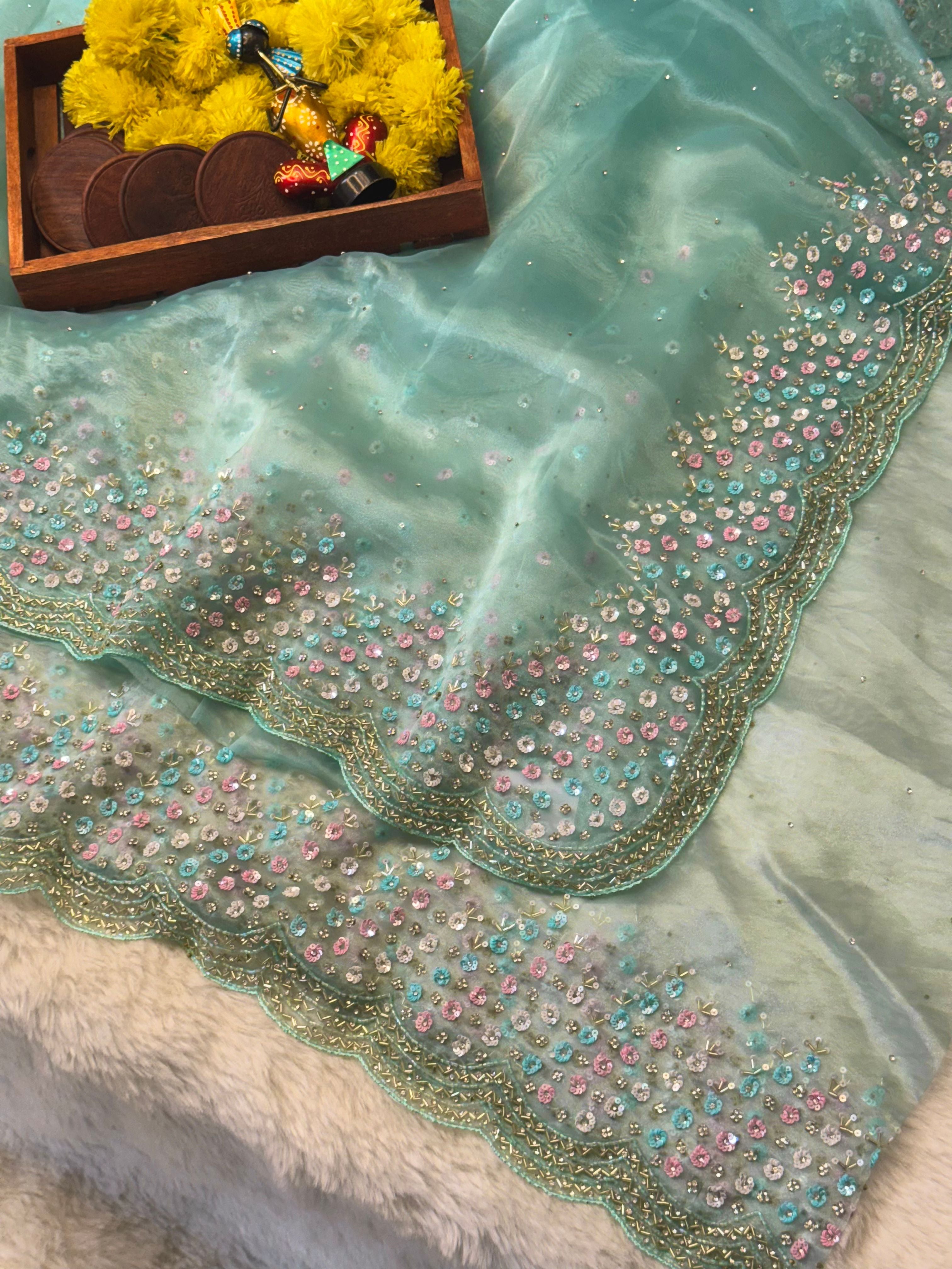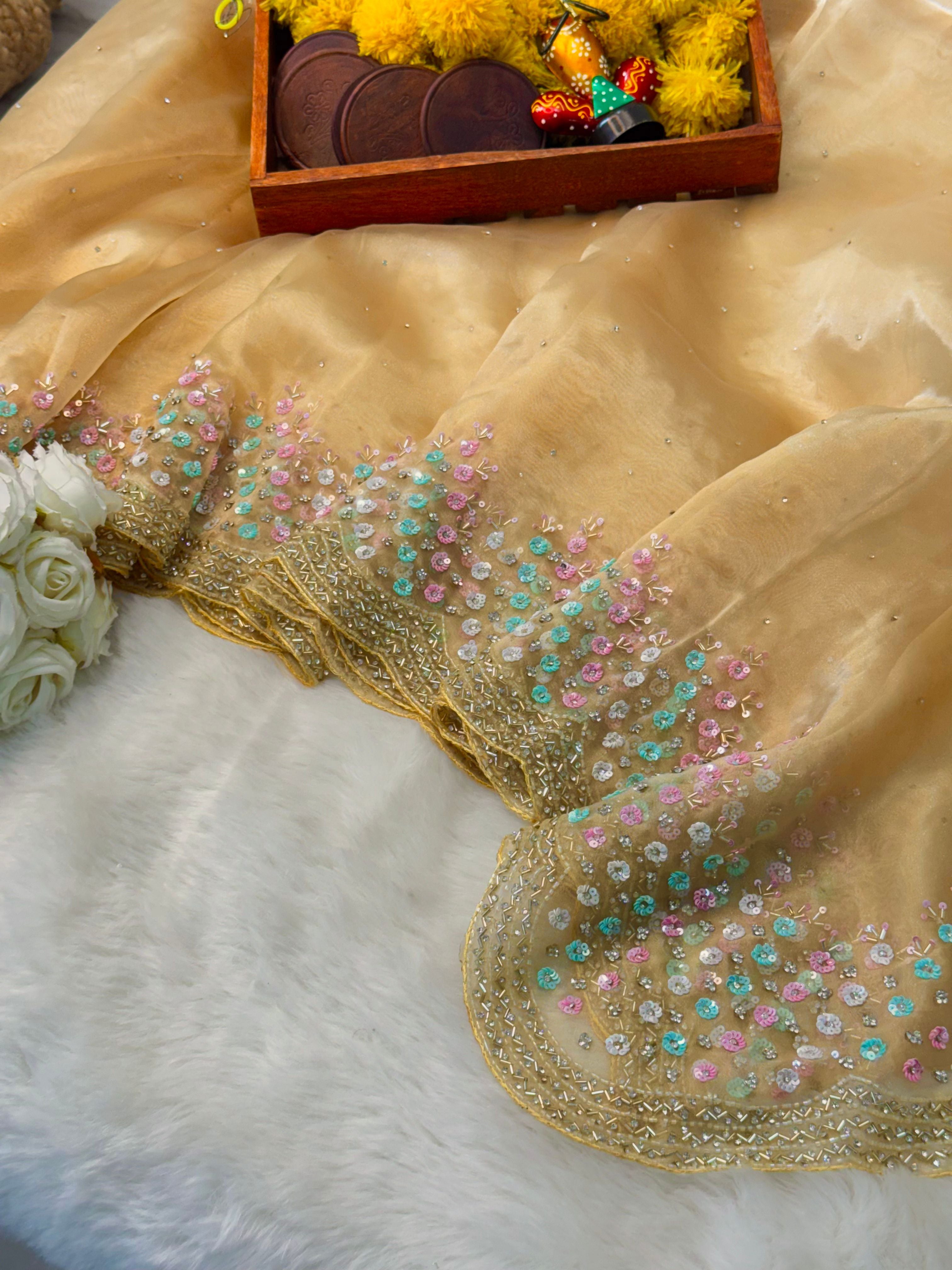 ✨ Mausam Tissue Saree with Multicolor Sequin Floral Border & Scalloped Edges