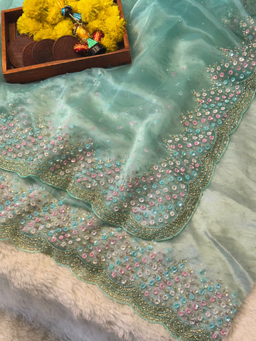 Say hello to festive elegance with our Mausam Tissue Saree featuring a vibrant burst of hand-embroidered multicolor floral sequins in pink, turquoise, white, and silver. Set on a luminous base of sheer Mausam tissue fabric, the saree is elevated with a scalloped border richly embellished with golden zari threadwork and intricate beading.