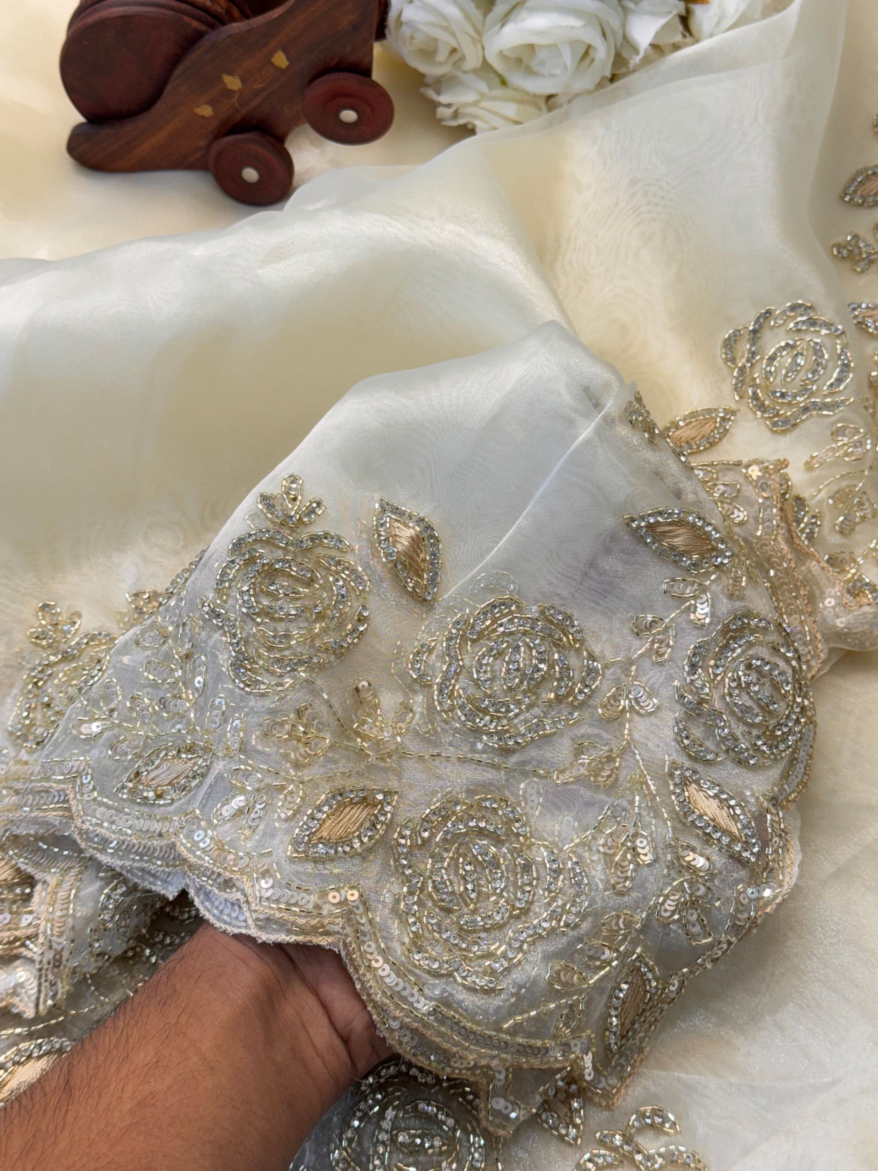 ✨ Mausam Tissue Saree with 3D Rose Motif Sequin & Zari Embroidery