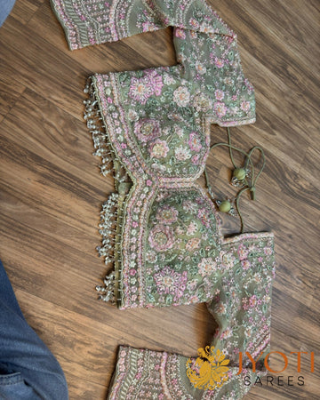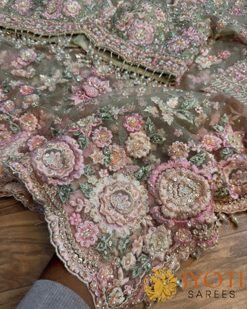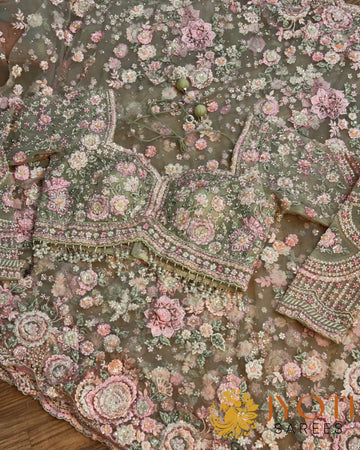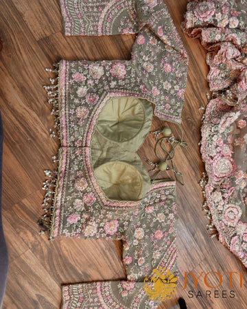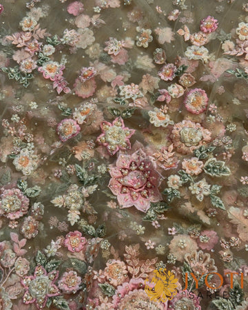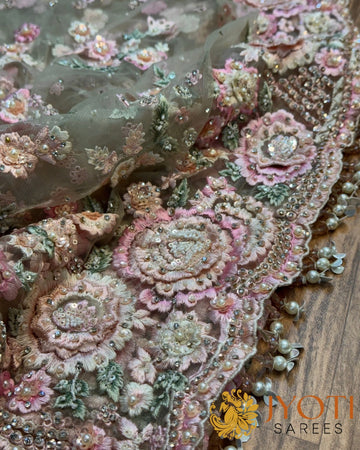Step into luxury with our Premium 3D Floral Net Saree Set, crafted in soft net and richly embroidered using multi-tone pastel threads, pearls and sequins to create a couture-grade floral effect.