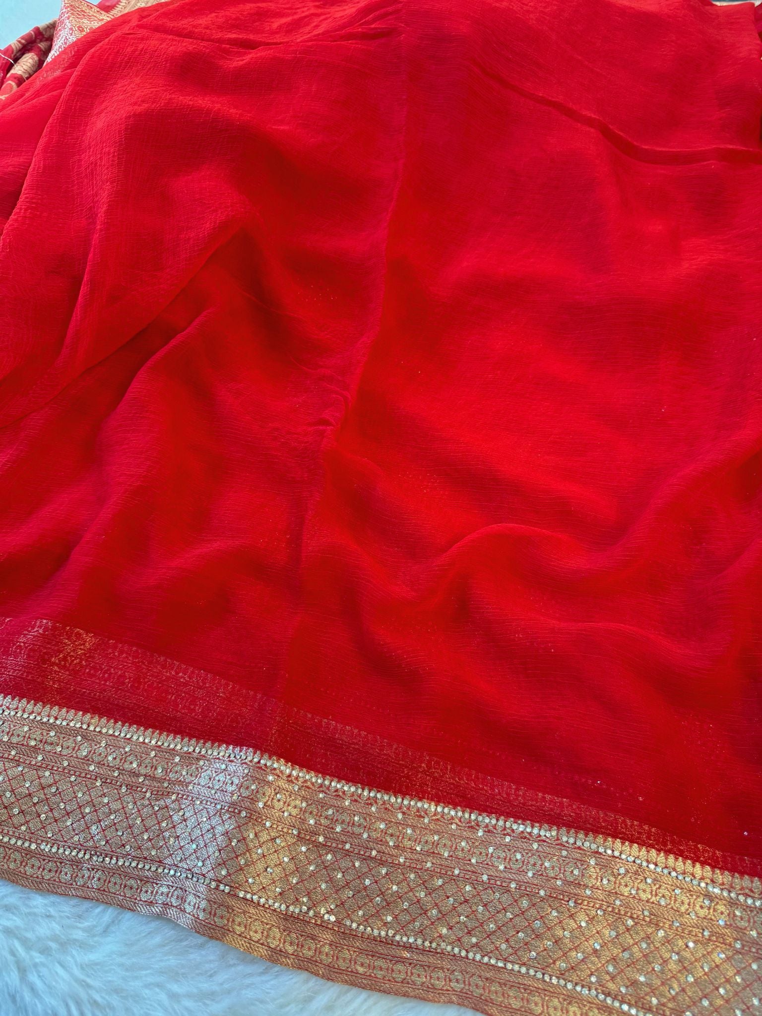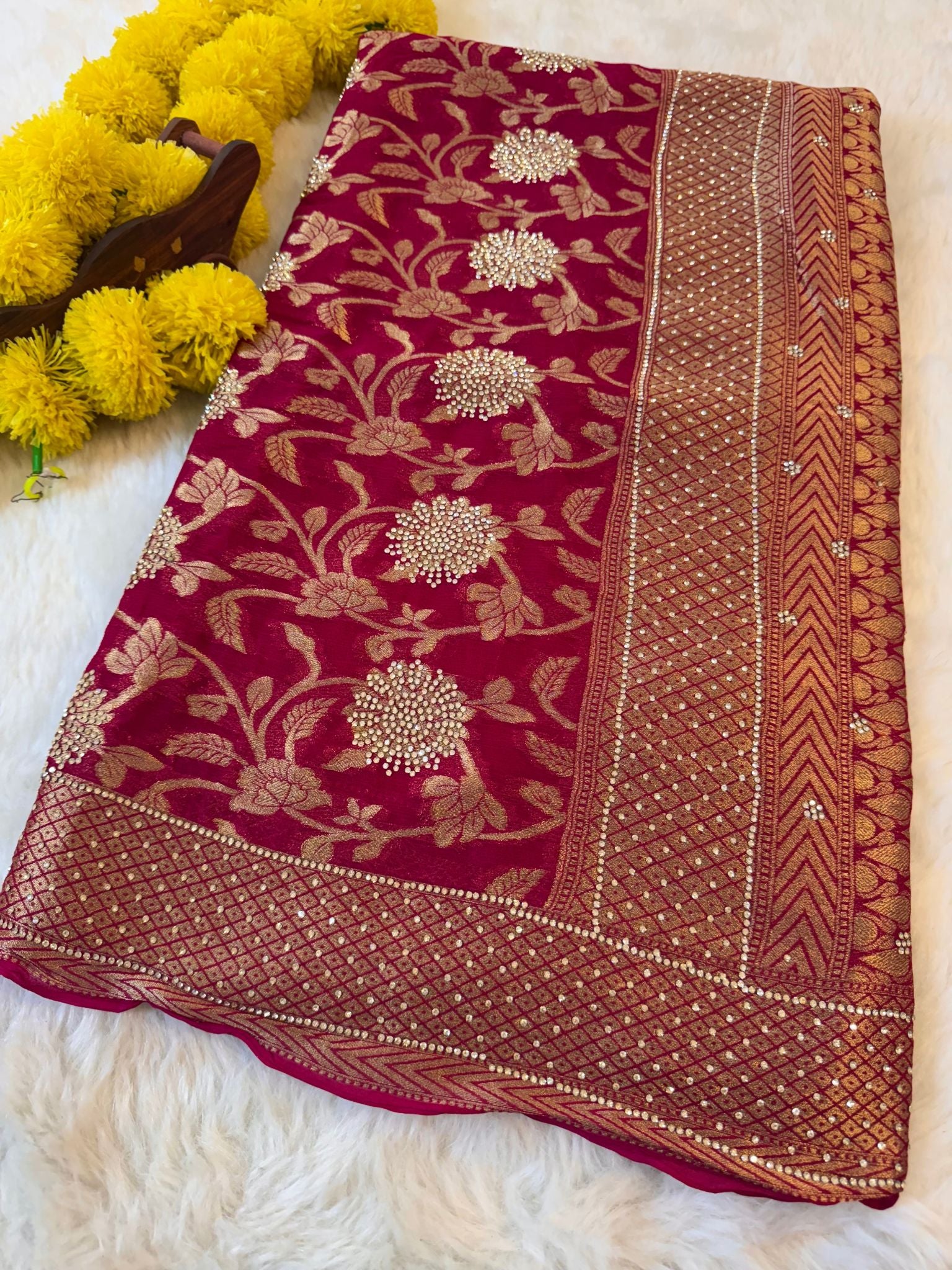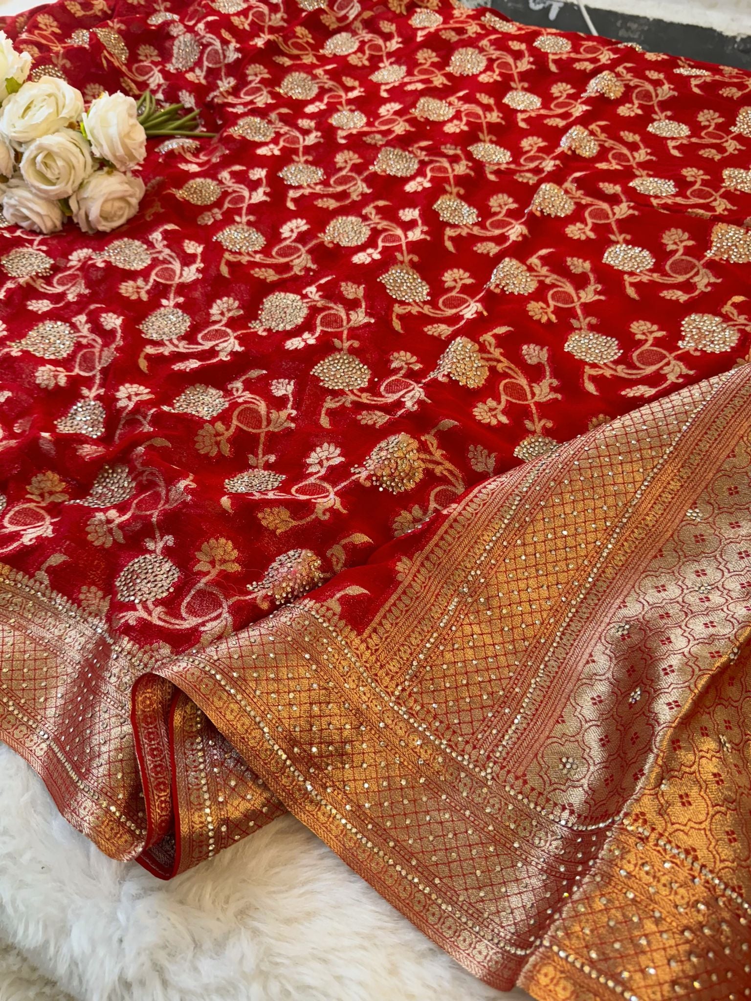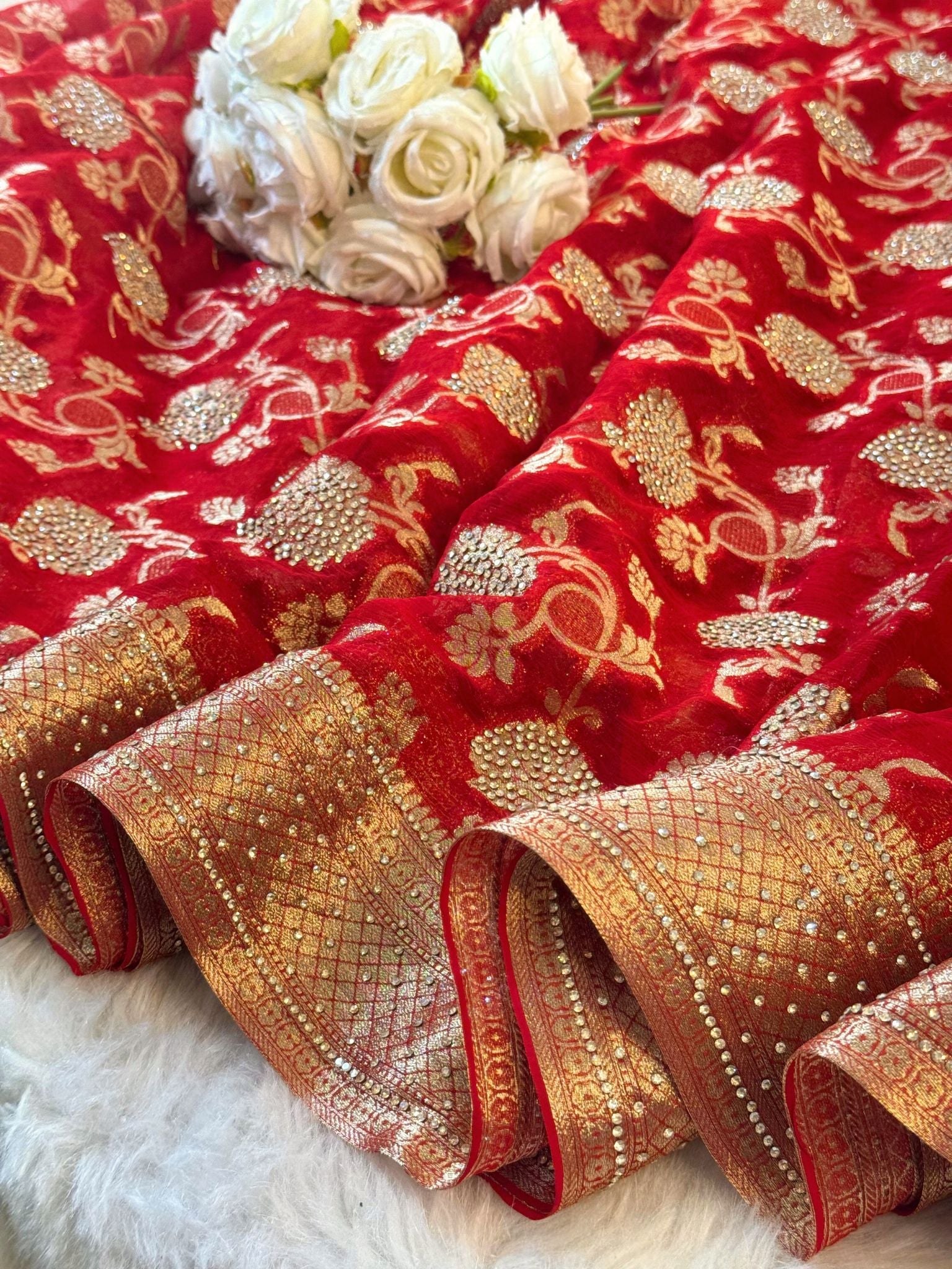 Step into sheer elegance with our Pure Khaddi Georgette Saree, adorned with luxurious zari weaving and sparkling embellishments. Perfect for weddings, festivals, and grand occasions.