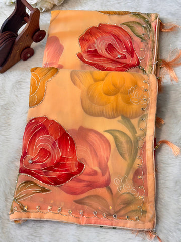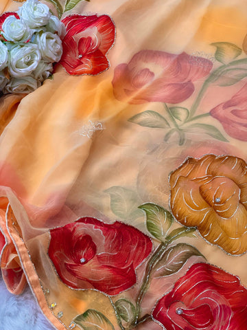 A soft, flowy floral printed saree featuring shaded blooms in rich tones, outlined with metallic detailing and finished with a delicate pearl border. Lightweight and elegant, it’s perfect for both casual outings and festive gatherings.