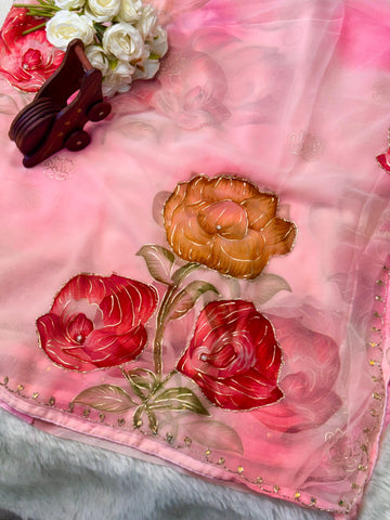 Floral Printed Saree with Pearl Border & Shaded Bloom