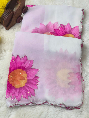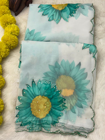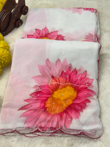 Floral Printed Lightweight Saree with Scalloped Border & Stone Highlights