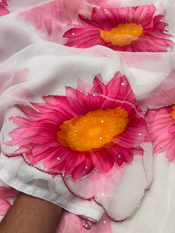 Our floral printed saree brings fresh, breezy vibes with its soft fabric, scalloped edges, and delicate stone highlights.