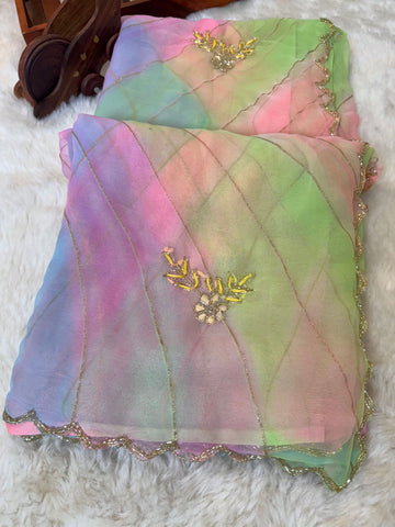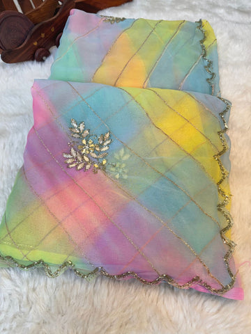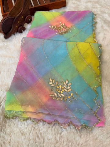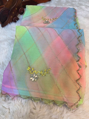 Pastel Rainbow Chiffon Saree with Stone Floral Work & Beaded Border