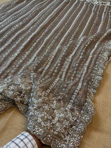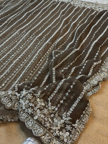 Elegance meets luxury in our Premium Net Saree, crafted with dense hand-style pearl embroidery, shimmering sequins, and a beautifully detailed scalloped border.