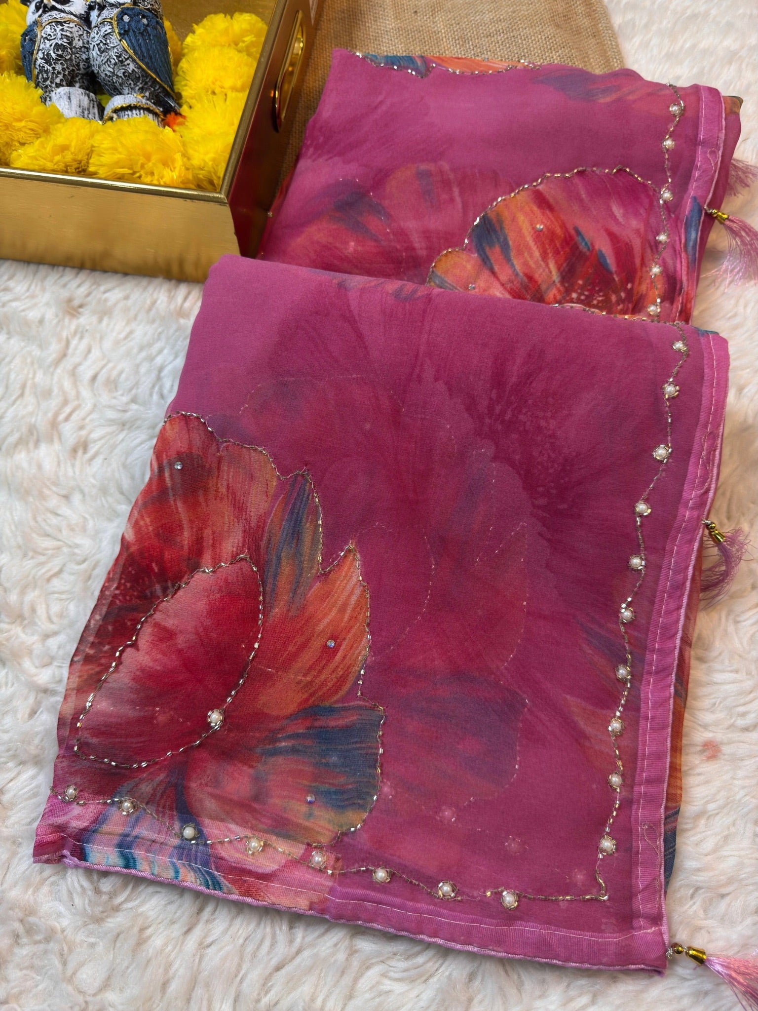 Crafted from soft-flowing georgette, these sarees feature vibrant floral prints highlighted with a delicate pearl-embellished border for an elegant festive finish.