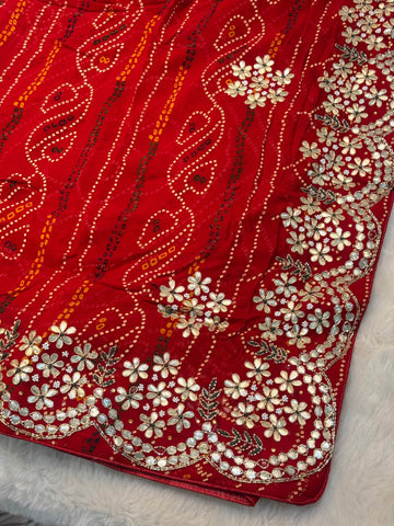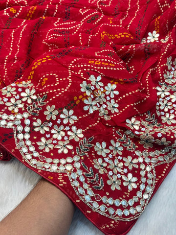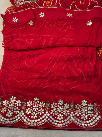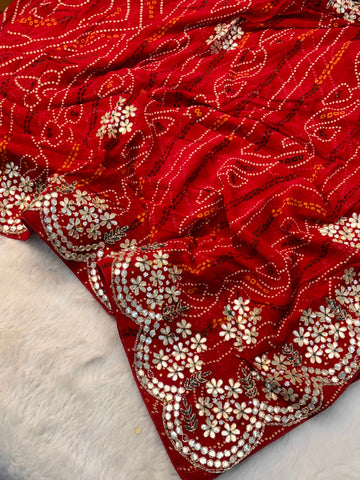 Red Bandhej Georgette Saree with Heavy Gotta Patti Floral Border