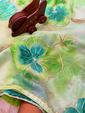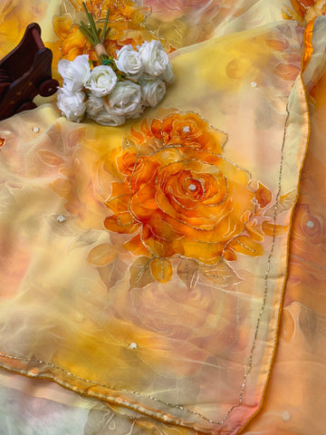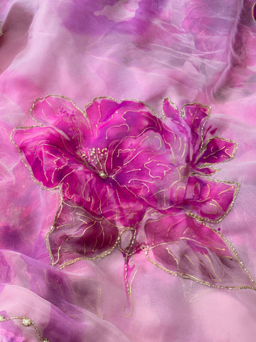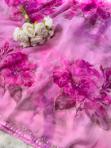 Shaded Floral Printed Saree with Pearl & Metallic Outline