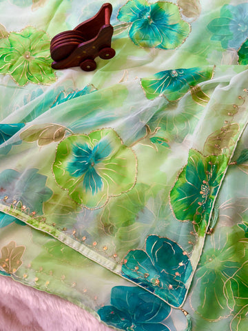 A dreamy collection of lightweight sarees featuring large shaded floral prints, highlighted with metallic outlines and delicate pearl accents. Perfect for festive occasions, parties, and gifting, these sarees blend elegance with comfort.