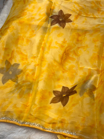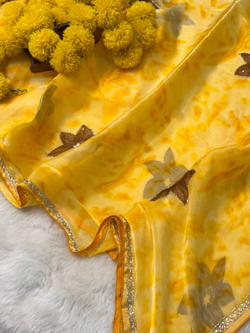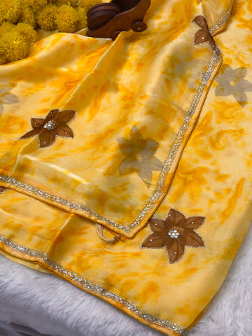 Yellow Chinon Floral Saree with 3D Applique & Sequin Border