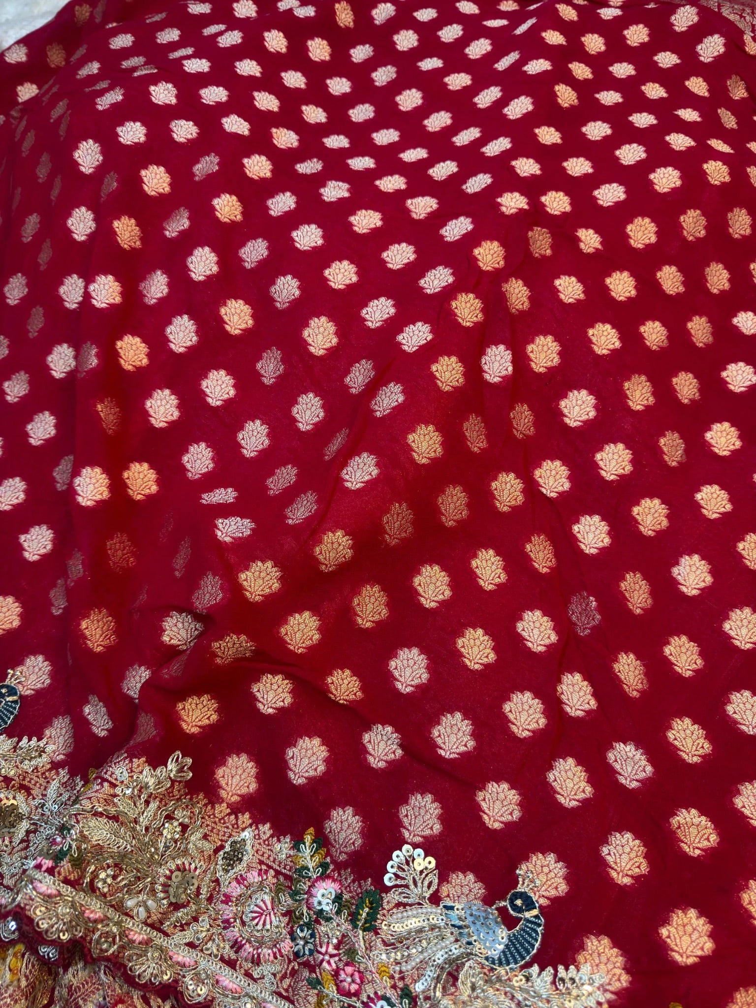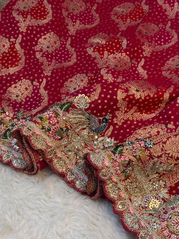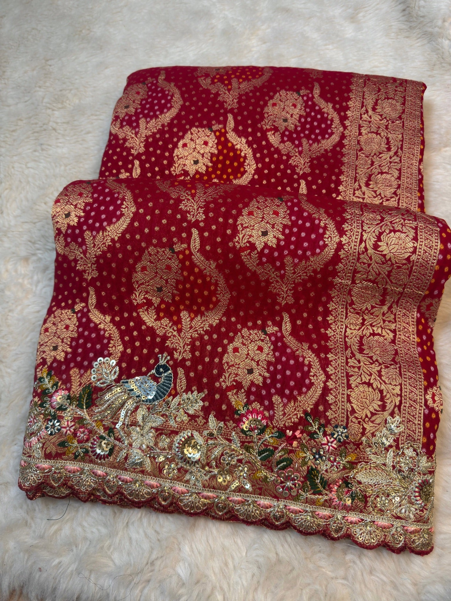 This stunning khaddi georgette saree features classic Bandhani-inspired patterns paired with a rich embroidered border highlighted by elegant peacock and floral detailing. The intricate craftsmanship gives the saree a regal festive appeal.