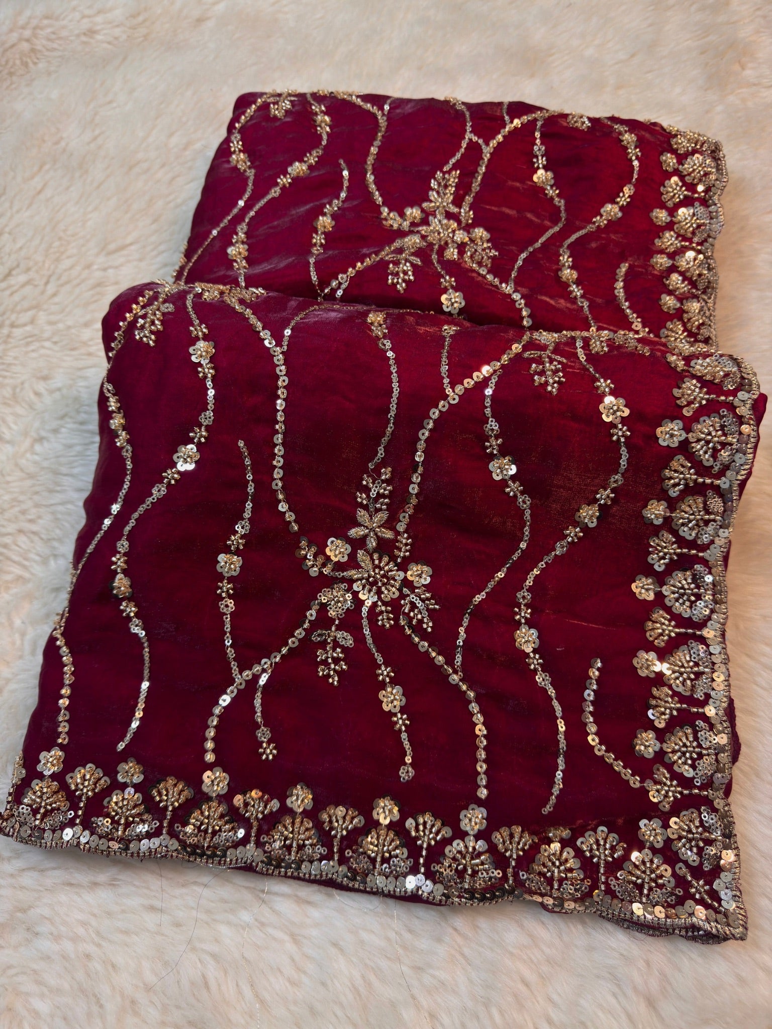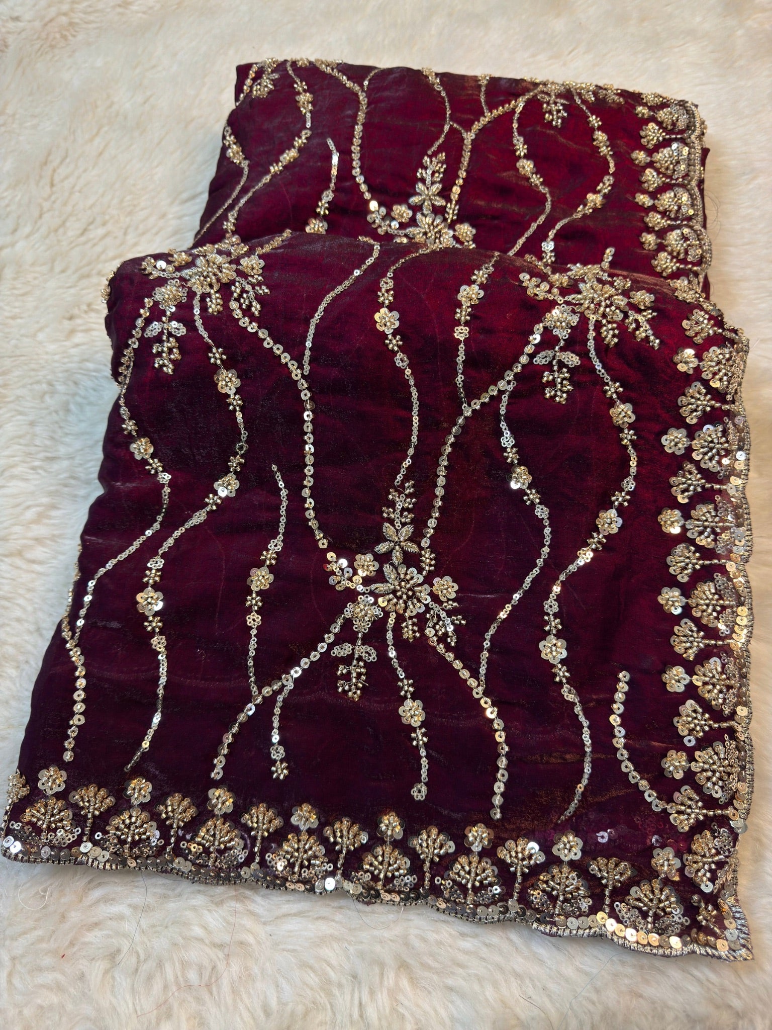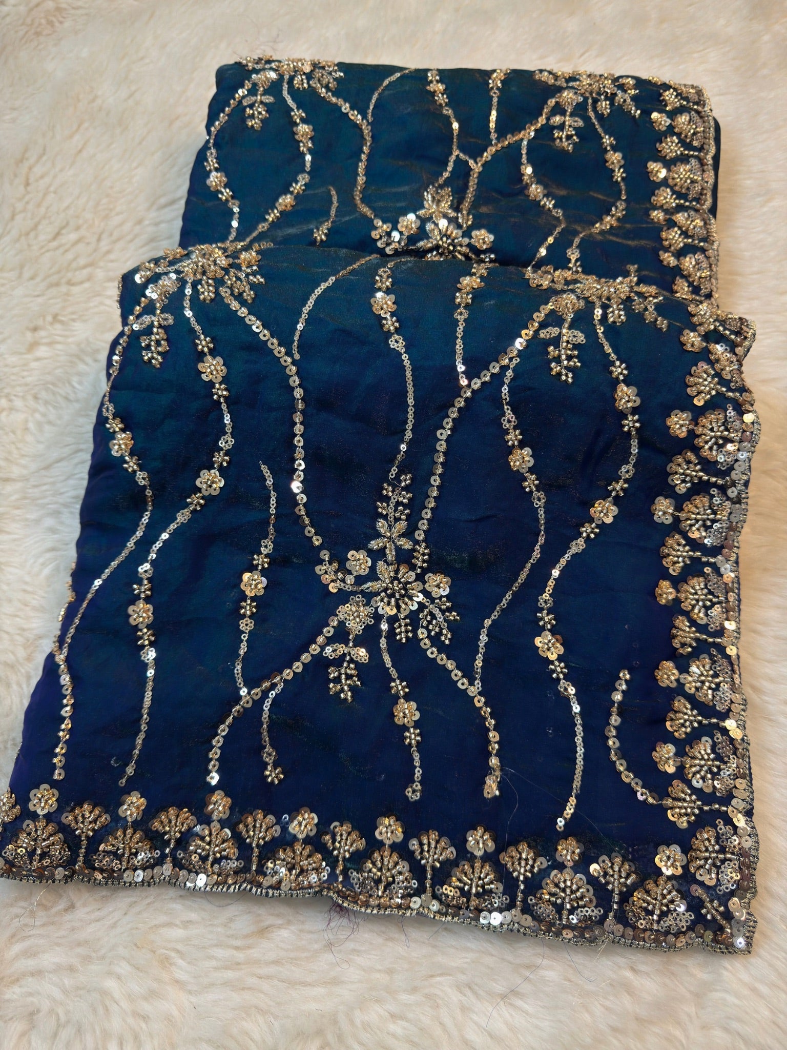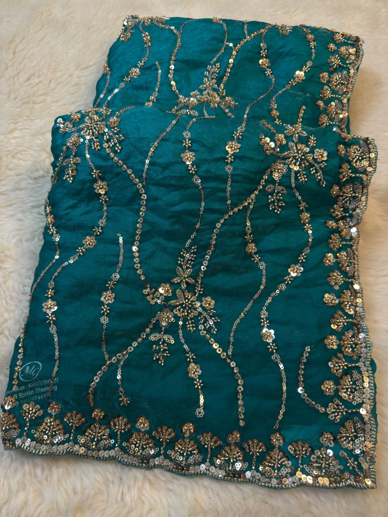 This premium Fendy Silk saree is beautifully adorned with all-over flowing floral and vine embroidery highlighted with sequin detailing. The saree is finished with a heavy floral sequin embroidered border, giving it a luxurious and festive appeal.