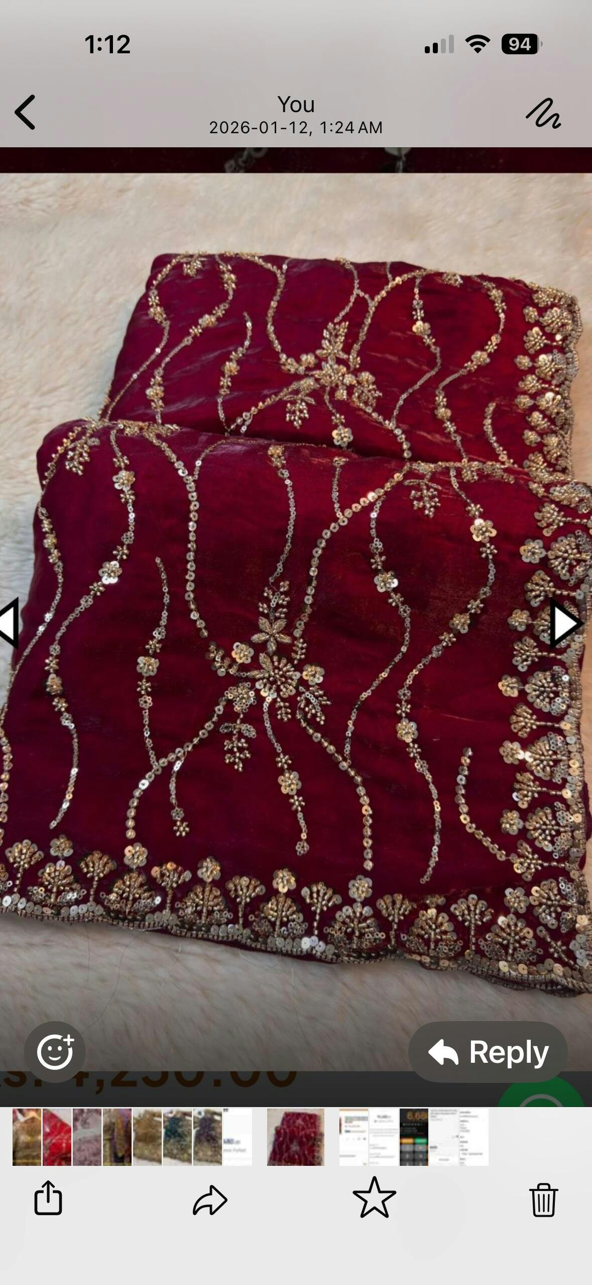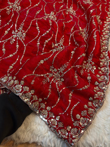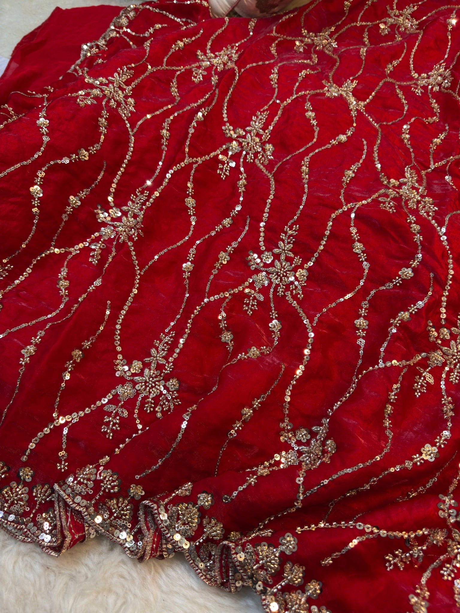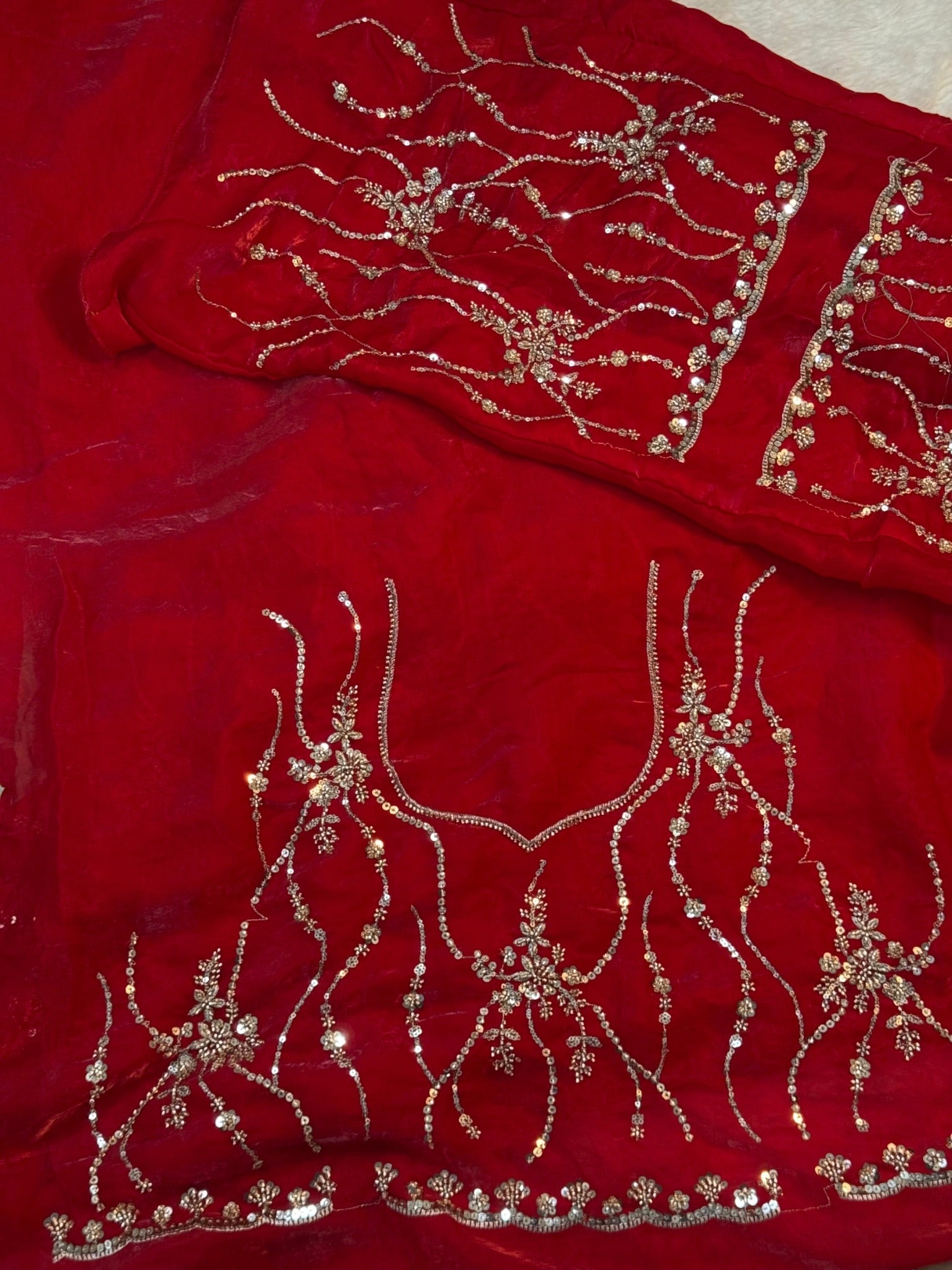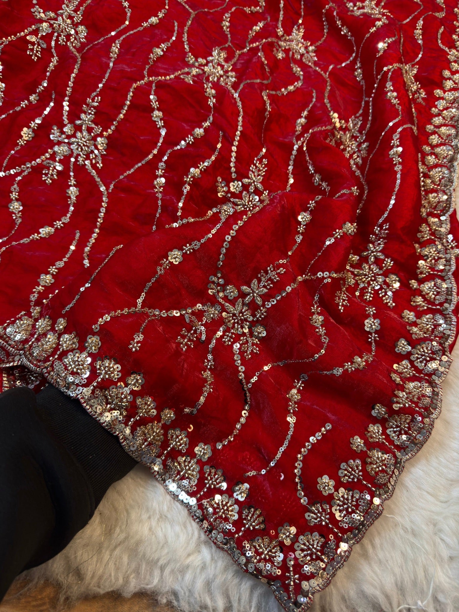 This premium Fendy Silk saree is beautifully adorned with all-over flowing floral and vine embroidery highlighted with sequin detailing. The saree is finished with a heavy floral sequin embroidered border, giving it a luxurious and festive appeal.