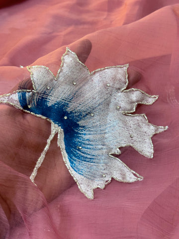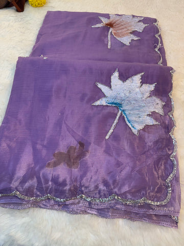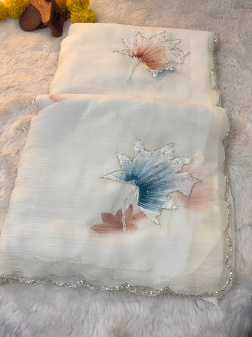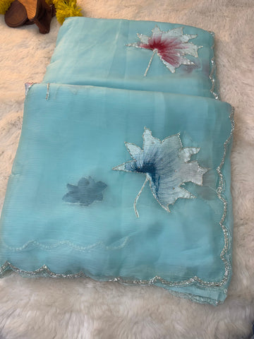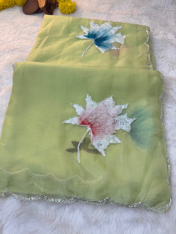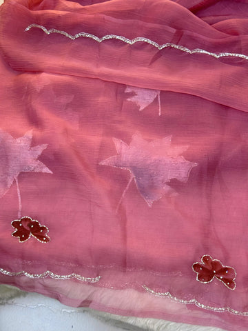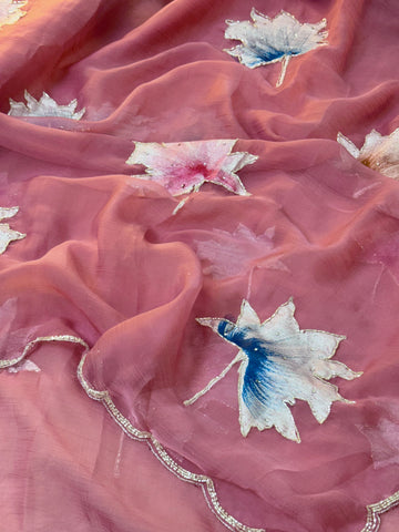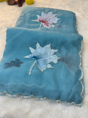 Chiffon Saree with Hand-Painted Leaf Motifs & Sequin Border