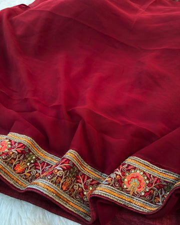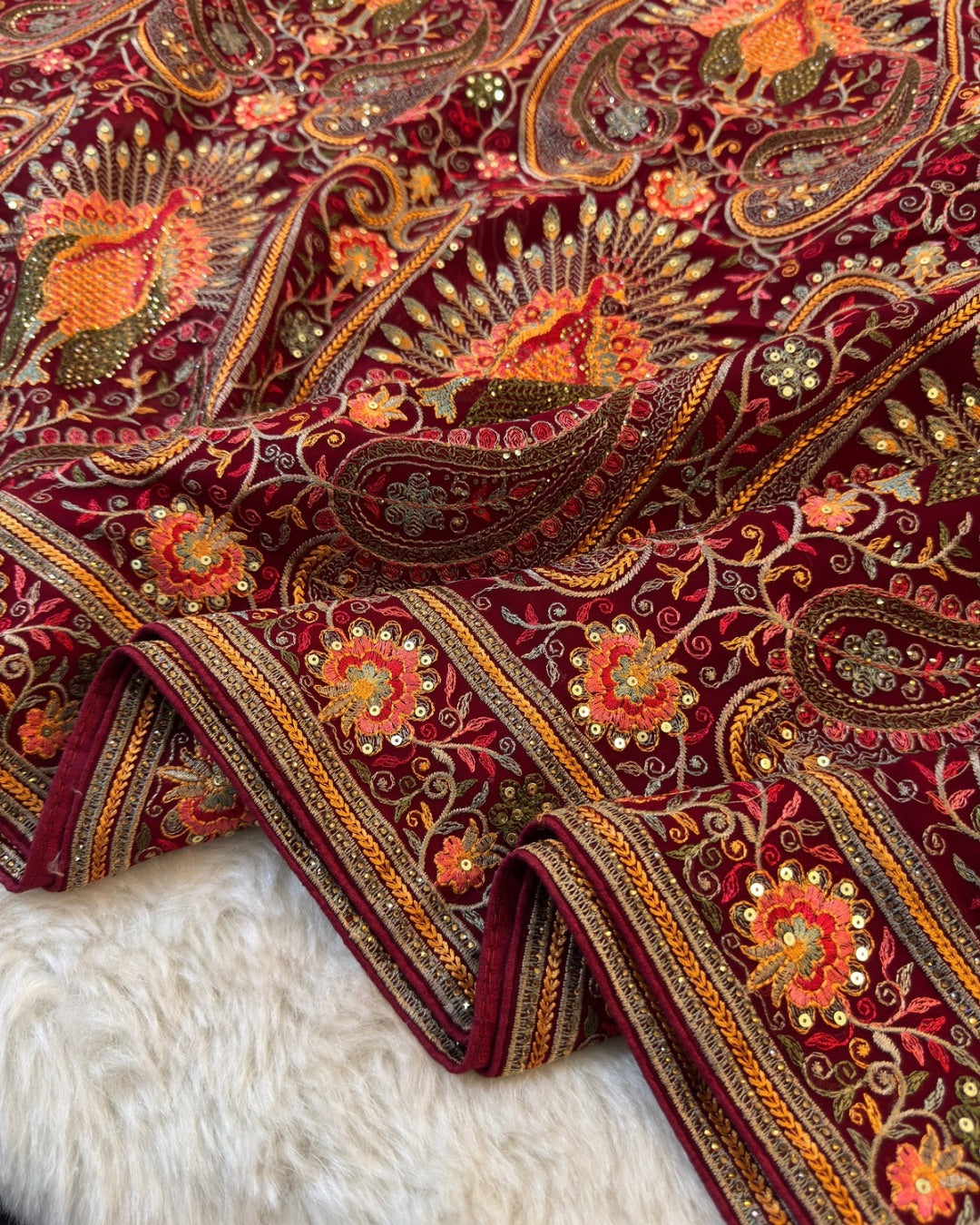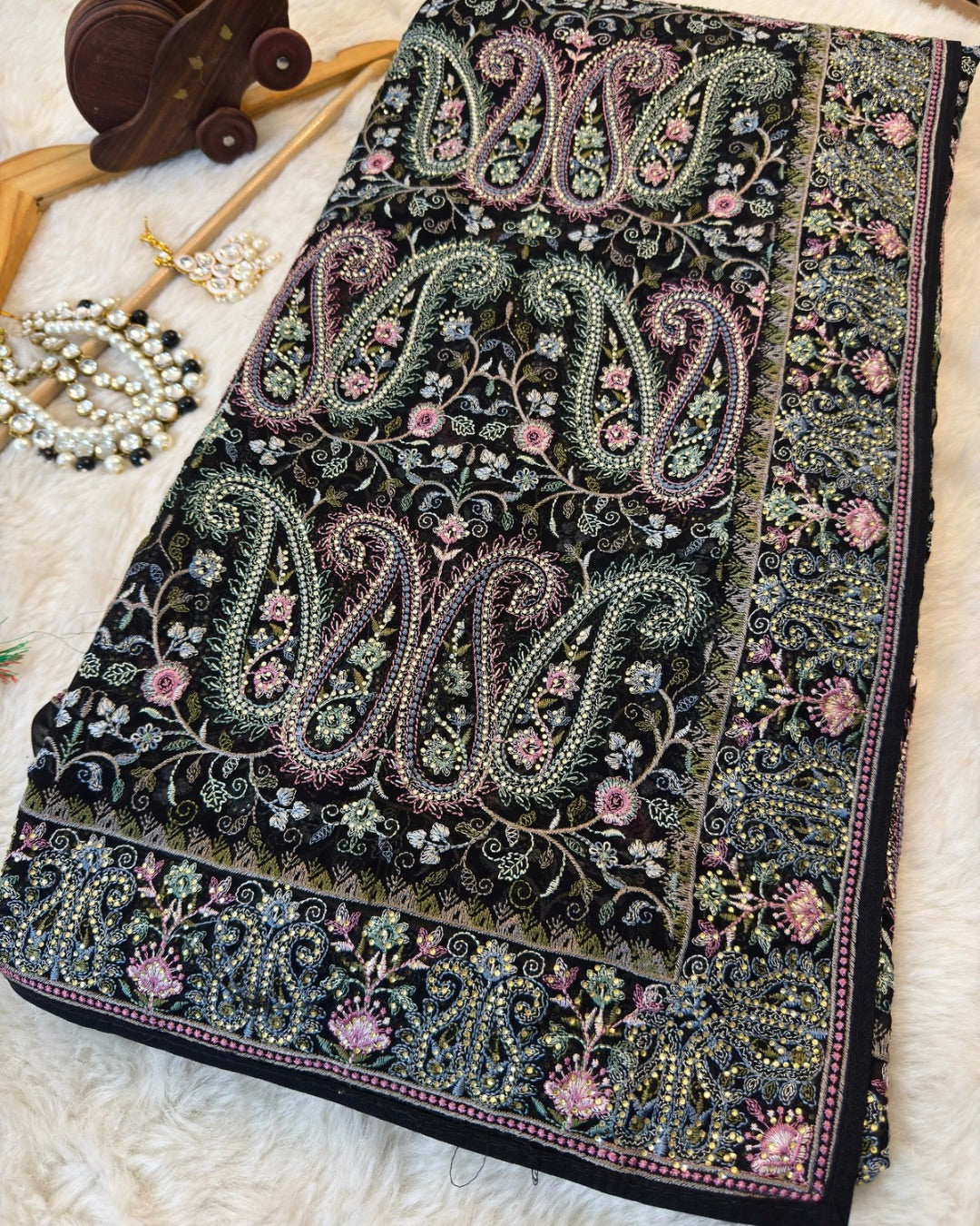 A masterpiece of craftsmanship, this saree features authentic Kashmiri-style embroidery with detailed paisley motifs, floral patterns, zari highlights, sequins, and rich threadwork.