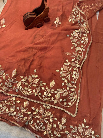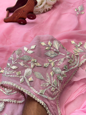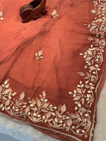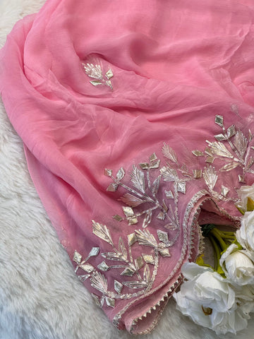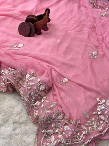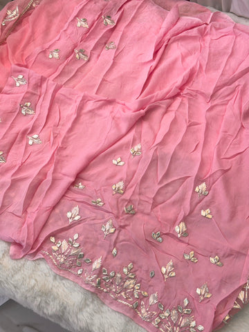 Pure Chiffon Saree with Hand Embroidered Leaf Motifs & Gota Work Border