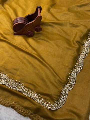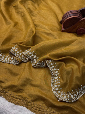 Premium Chocolate Rape Fabric Saree – Scalloped Floral Bead