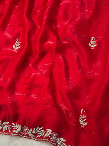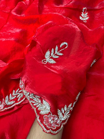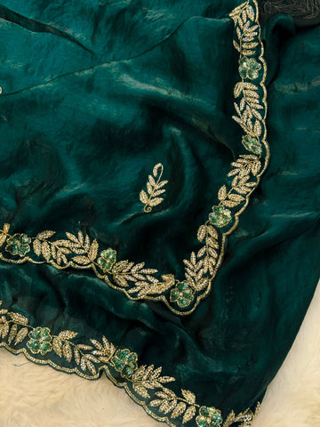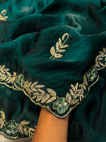 Shimmery Fendy silk saree with statement mirror and stone leaf motifs all over and floral hand-embroidered border. Available in festive jewel tones.