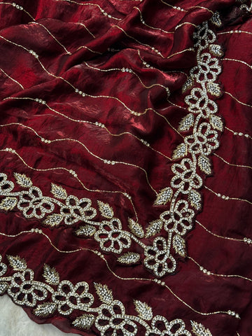 πŸŒ€ Wavy sequin and stone lines running across the saree for a shimmer effect