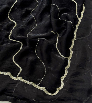 Bring home luxury with our Fendy Silk Saree – a statement piece crafted in a glossy, flowy fabric that catches the light beautifully. The saree features a unique scalloped wavy cut along the border and fine sequin detailing that adds just the right sparkle for festive evenings and glam occasions. Perfect for weddings, parties, or making a statement at a special celebration. Comes with an unstitched blouse