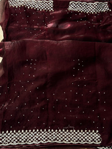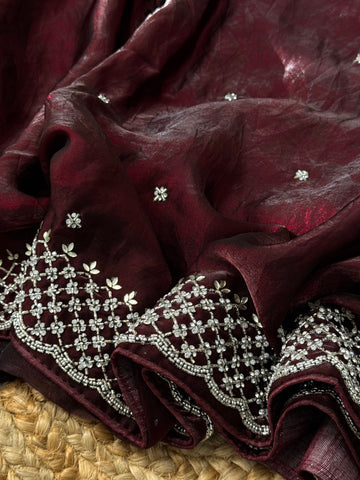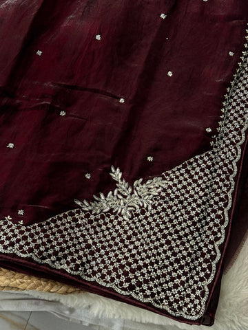 Rich Fendy silk saree in deep wine shade, adorned with jaal-style cutdana embroidery and floral corner detailing. Comes with a designer blouse piece with matching beadwork๐Ÿทย Where heritage meets elegance!