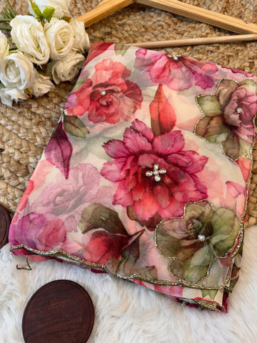 Printed Floral Saree Collection with Pearl Border & contrast blouse