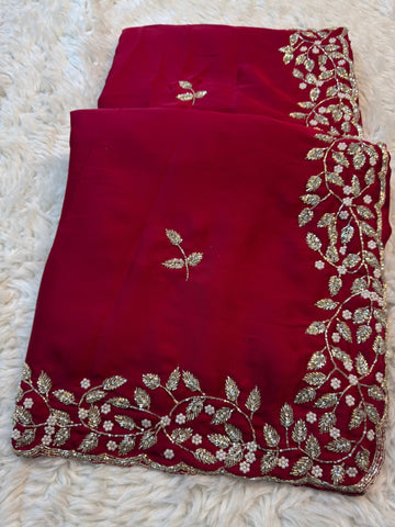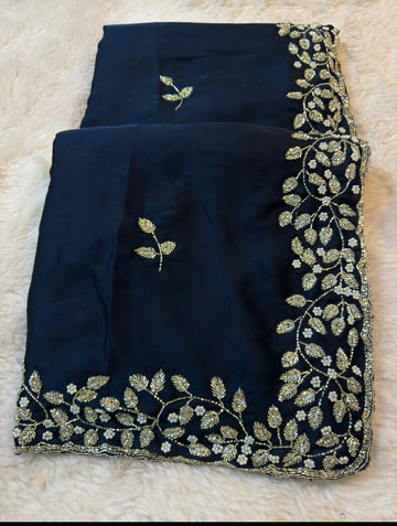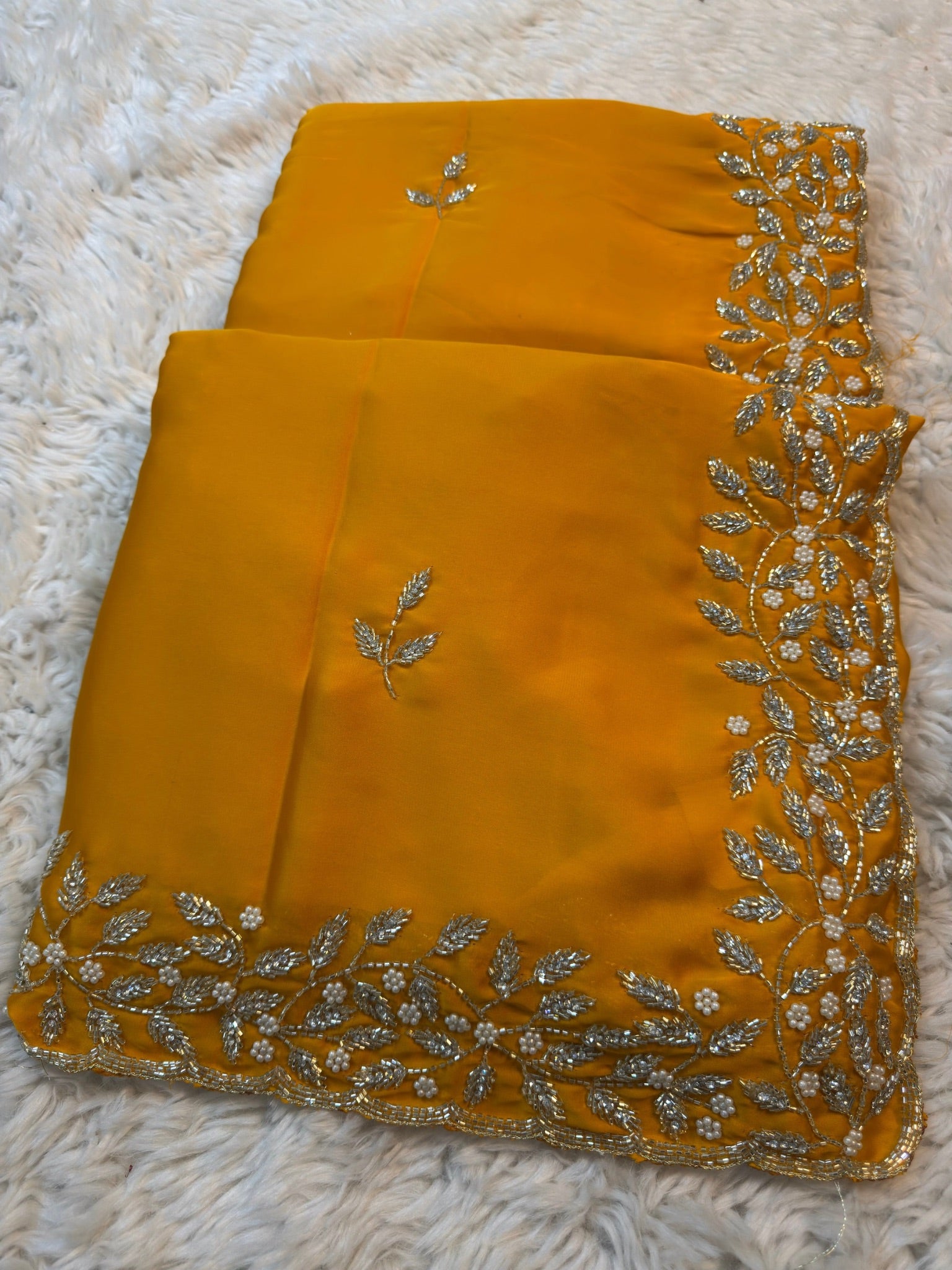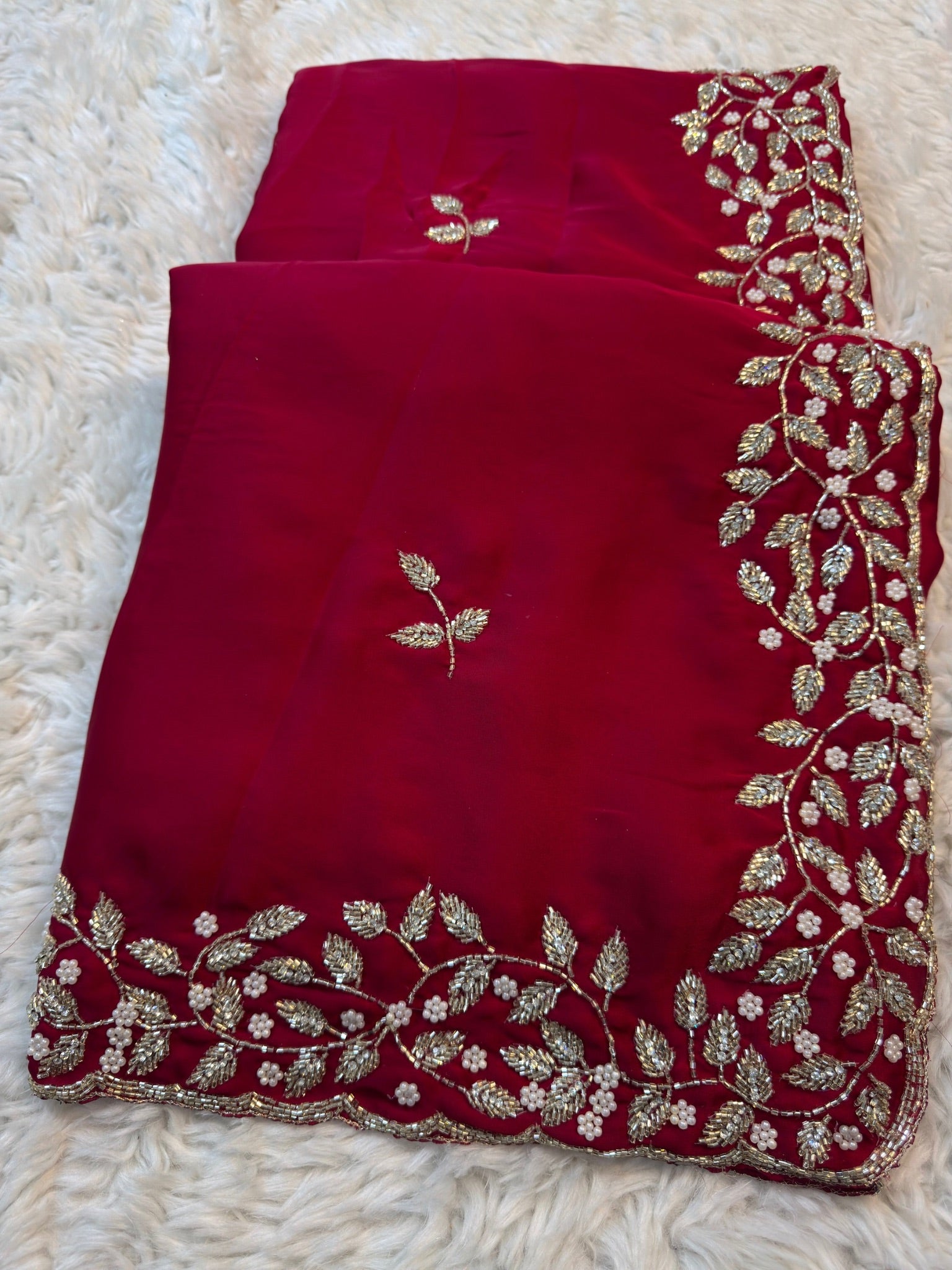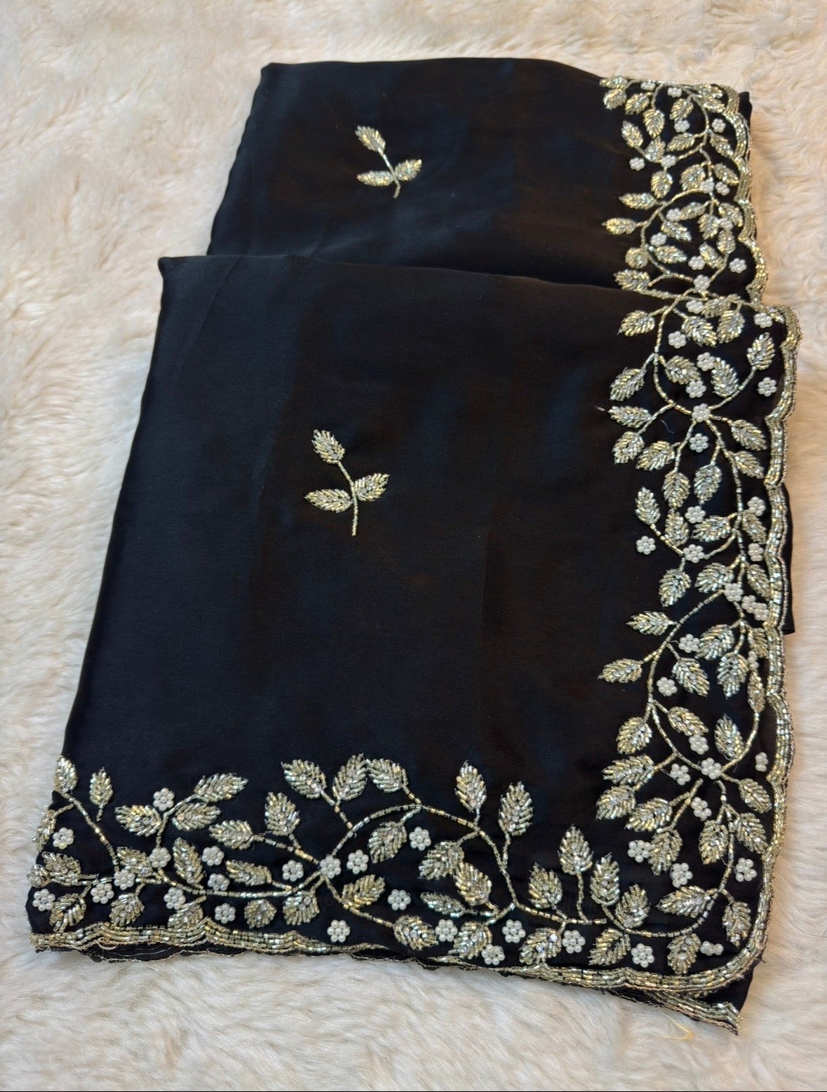 Premium Satin Silk Saree with Pearl Leaf Embroidered Border