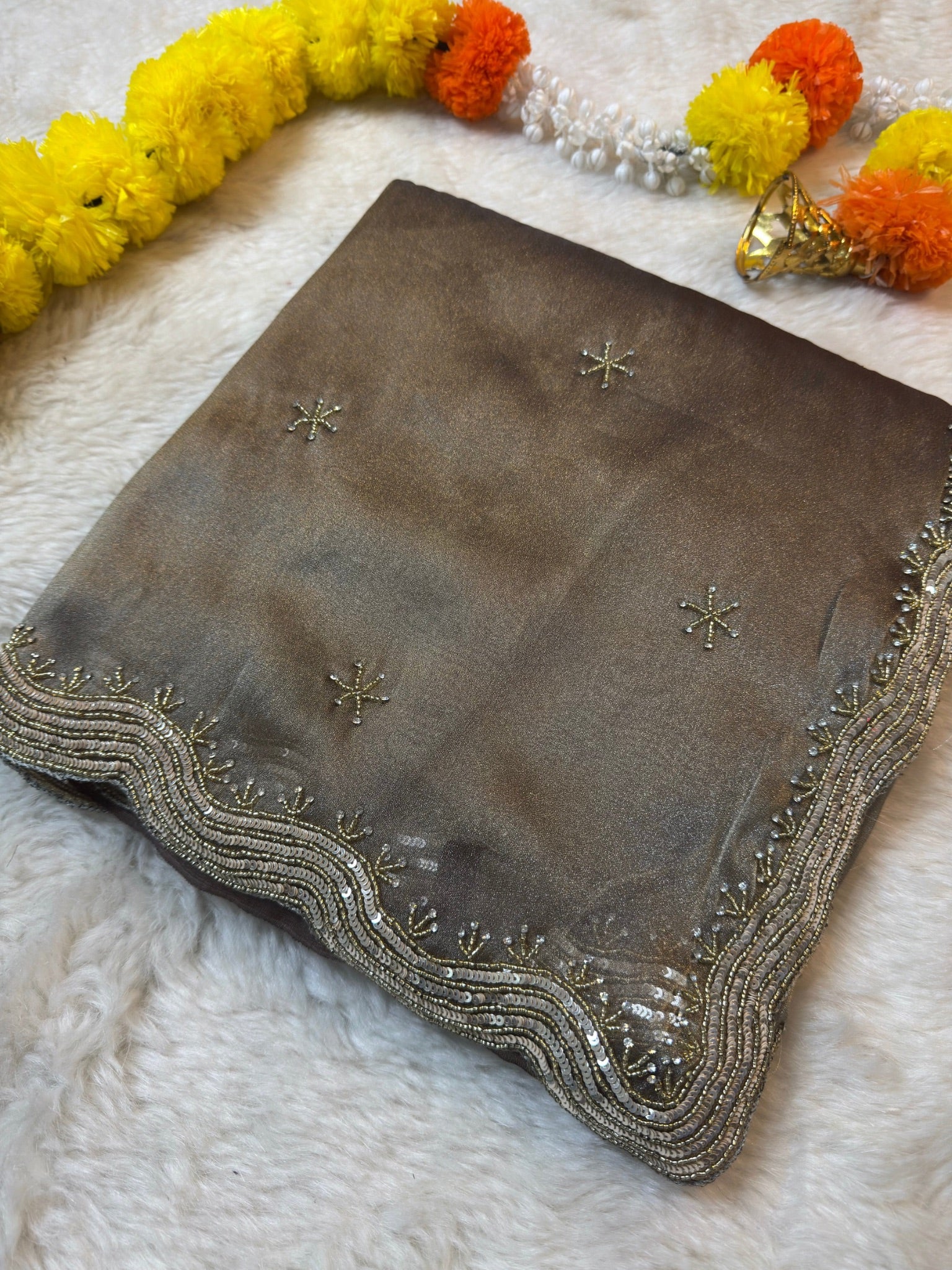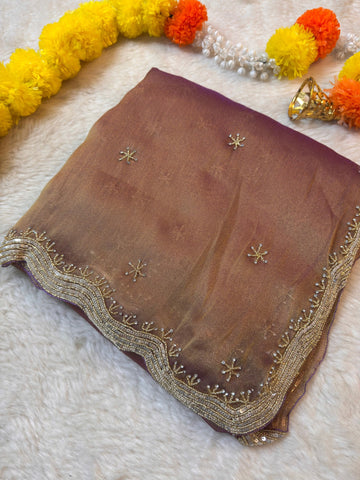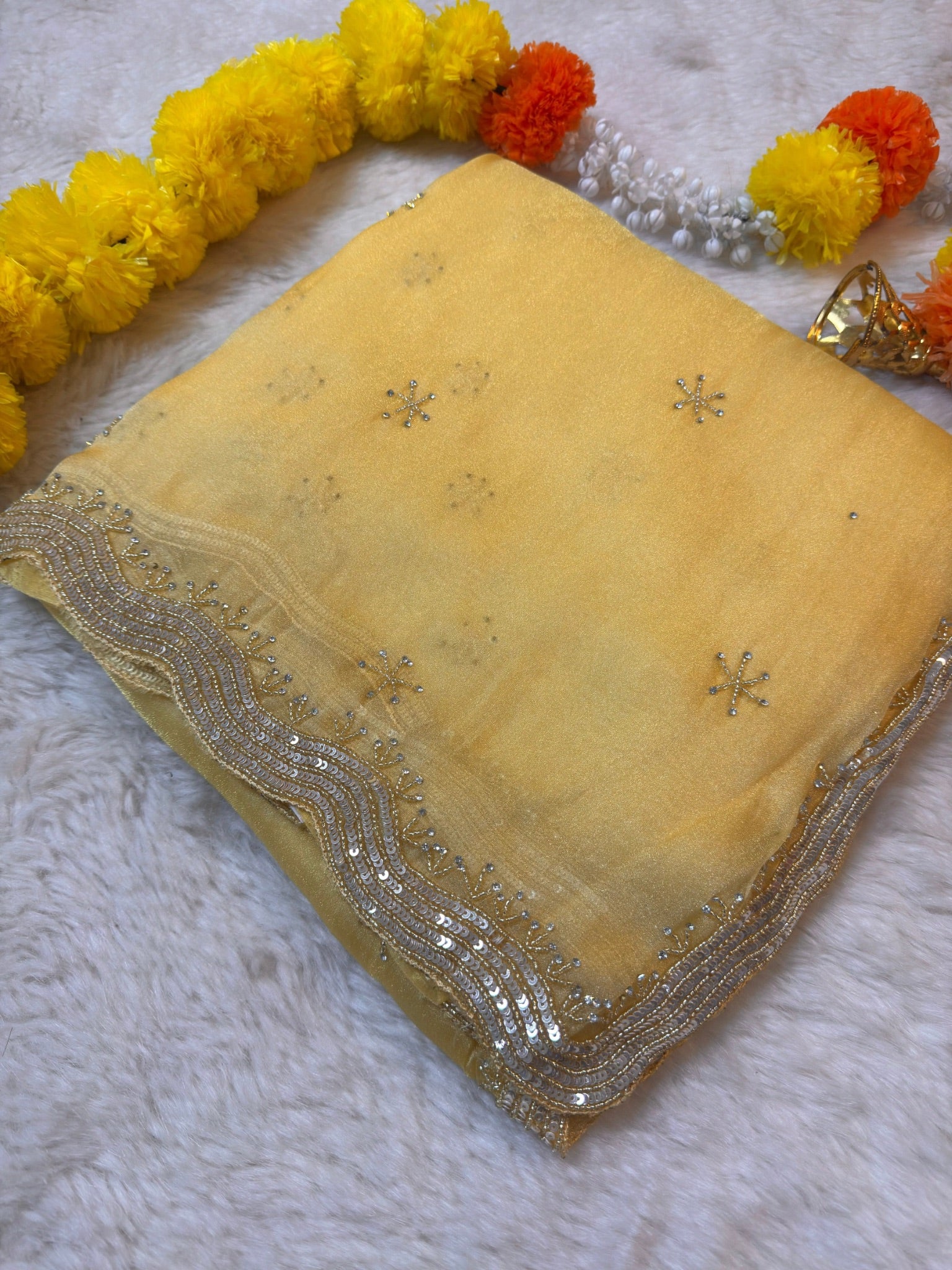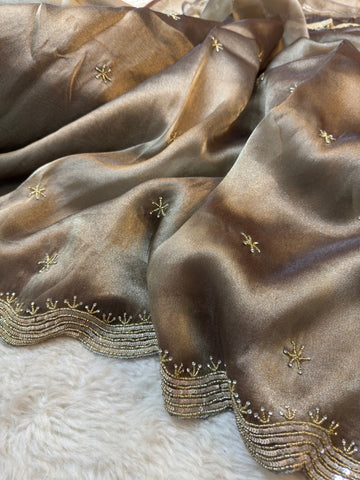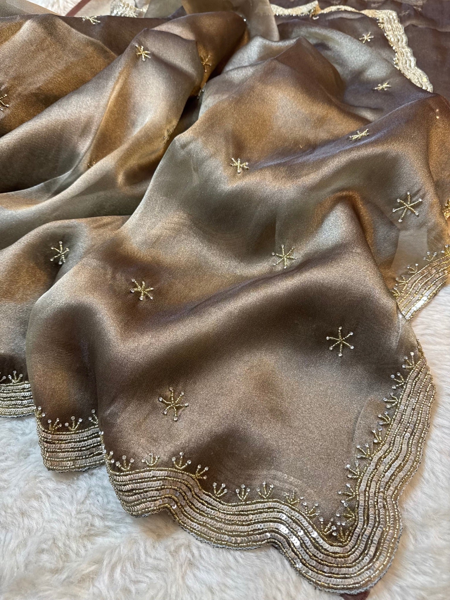 The saree features a soft shimmering zari silk base adorned with delicate star-shaped hand embellishments spread evenly across the body. A beautifully detailed wavy sequin and zari embroidered border adds richness while keeping the look graceful and classy.