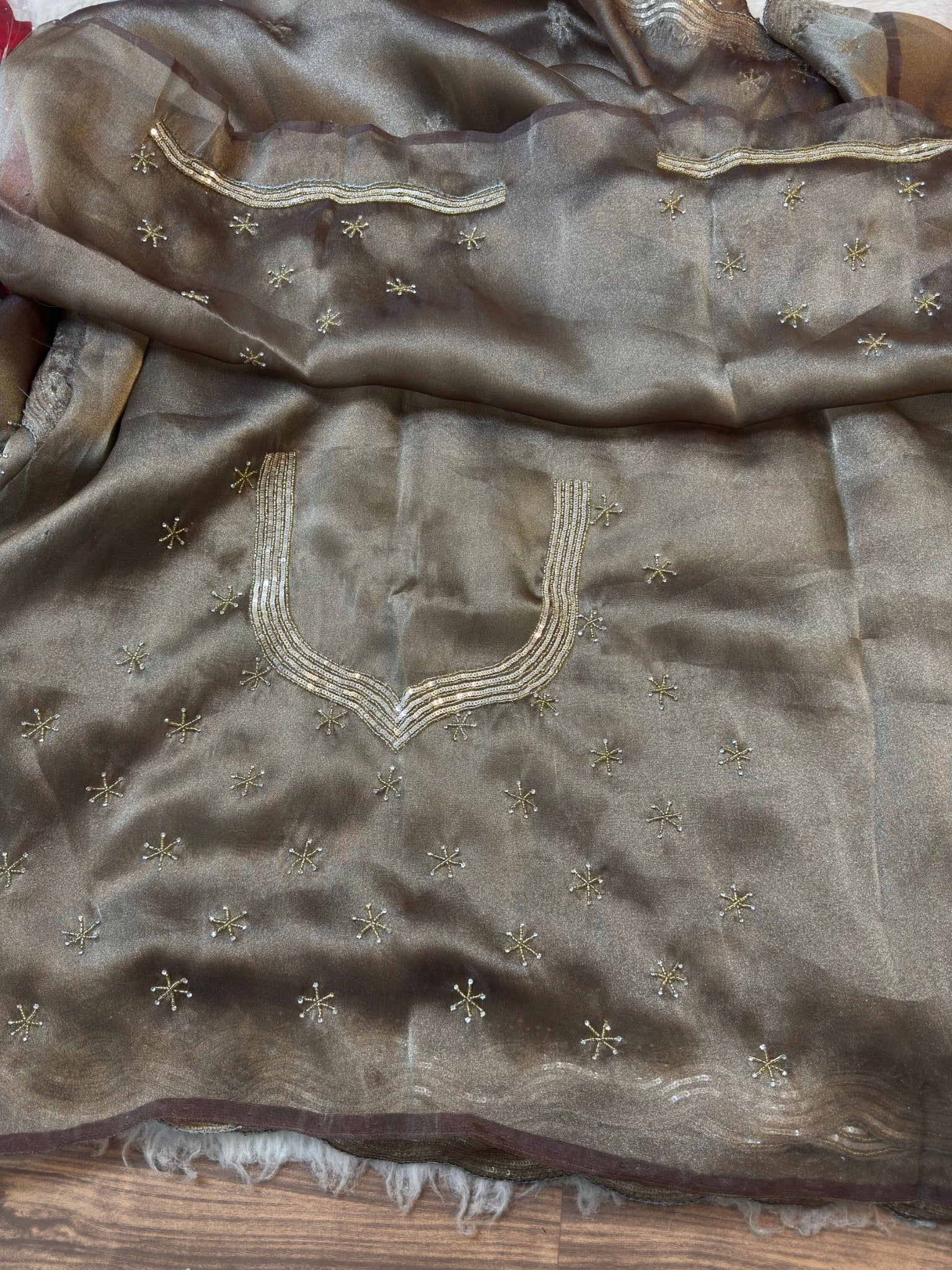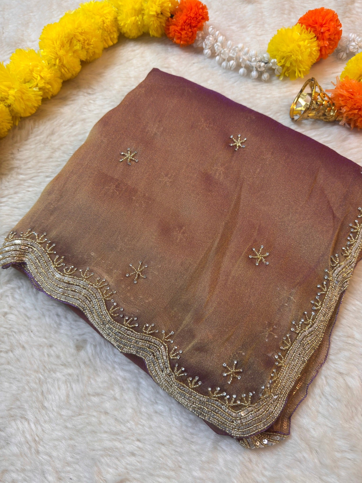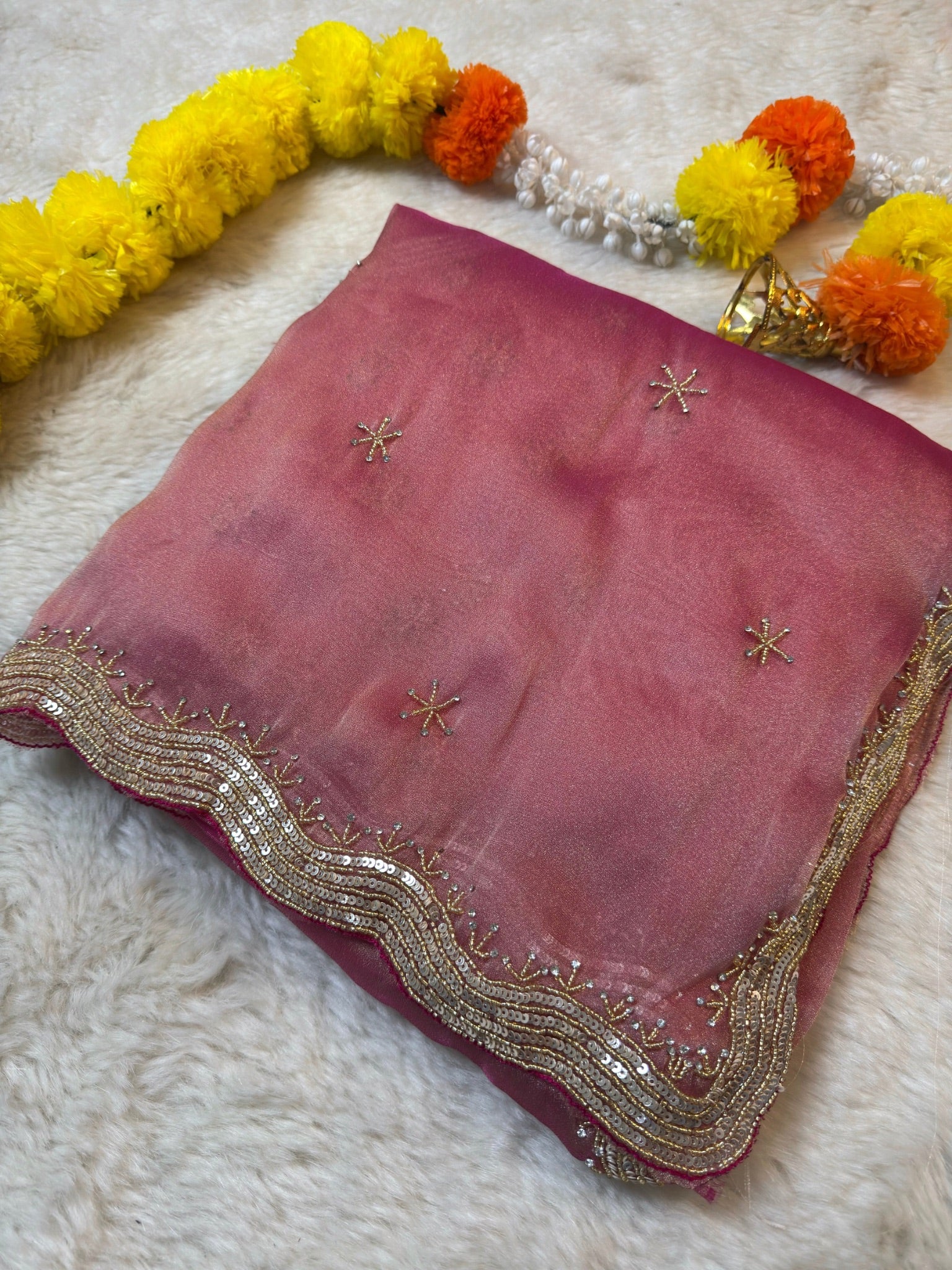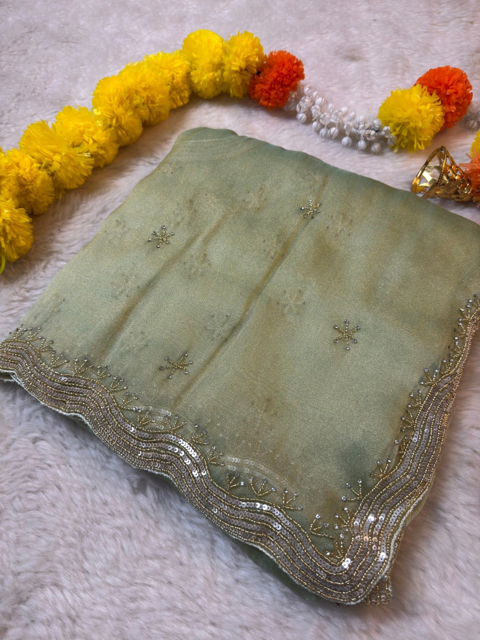 The saree features a soft shimmering zari silk base adorned with delicate star-shaped hand embellishments spread evenly across the body. A beautifully detailed wavy sequin and zari embroidered border adds richness while keeping the look graceful and classy.