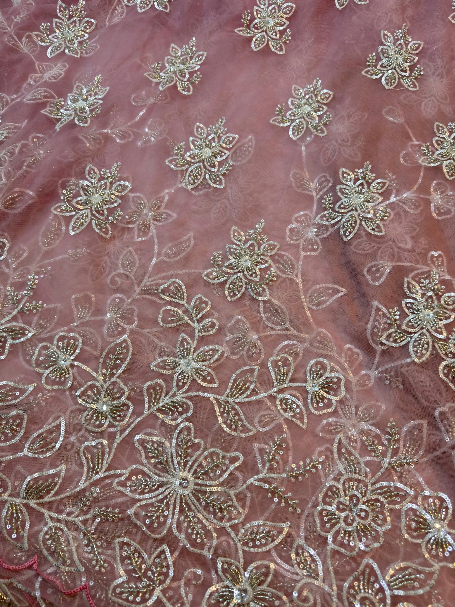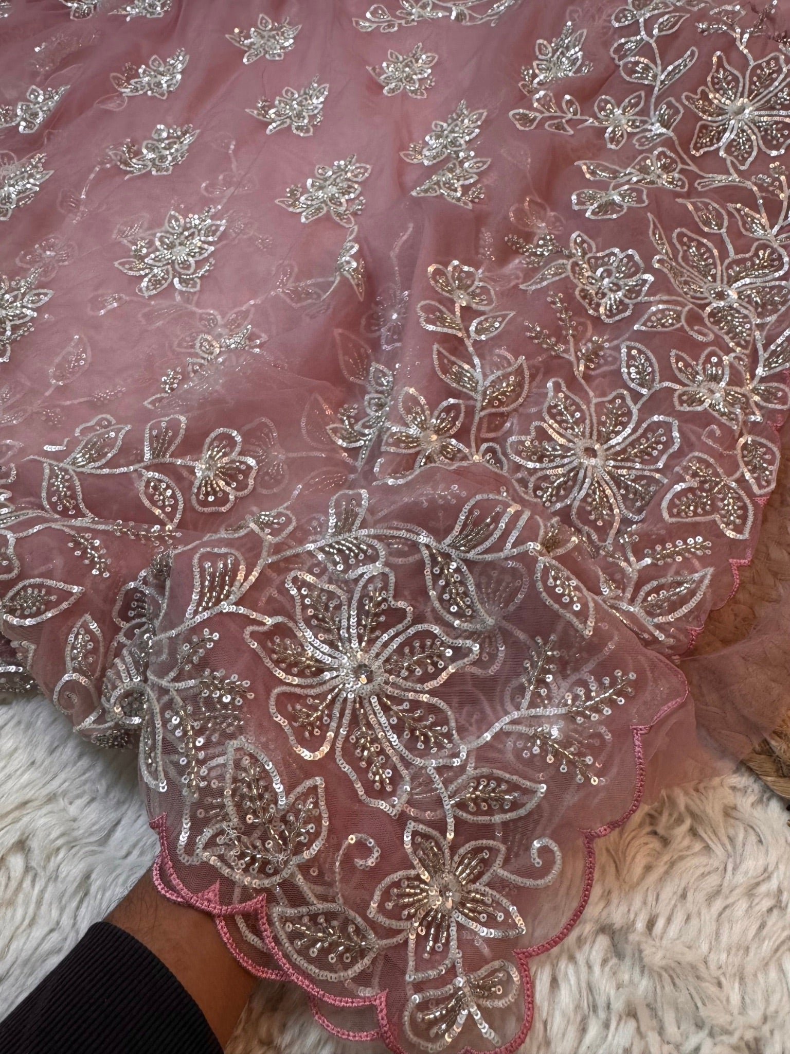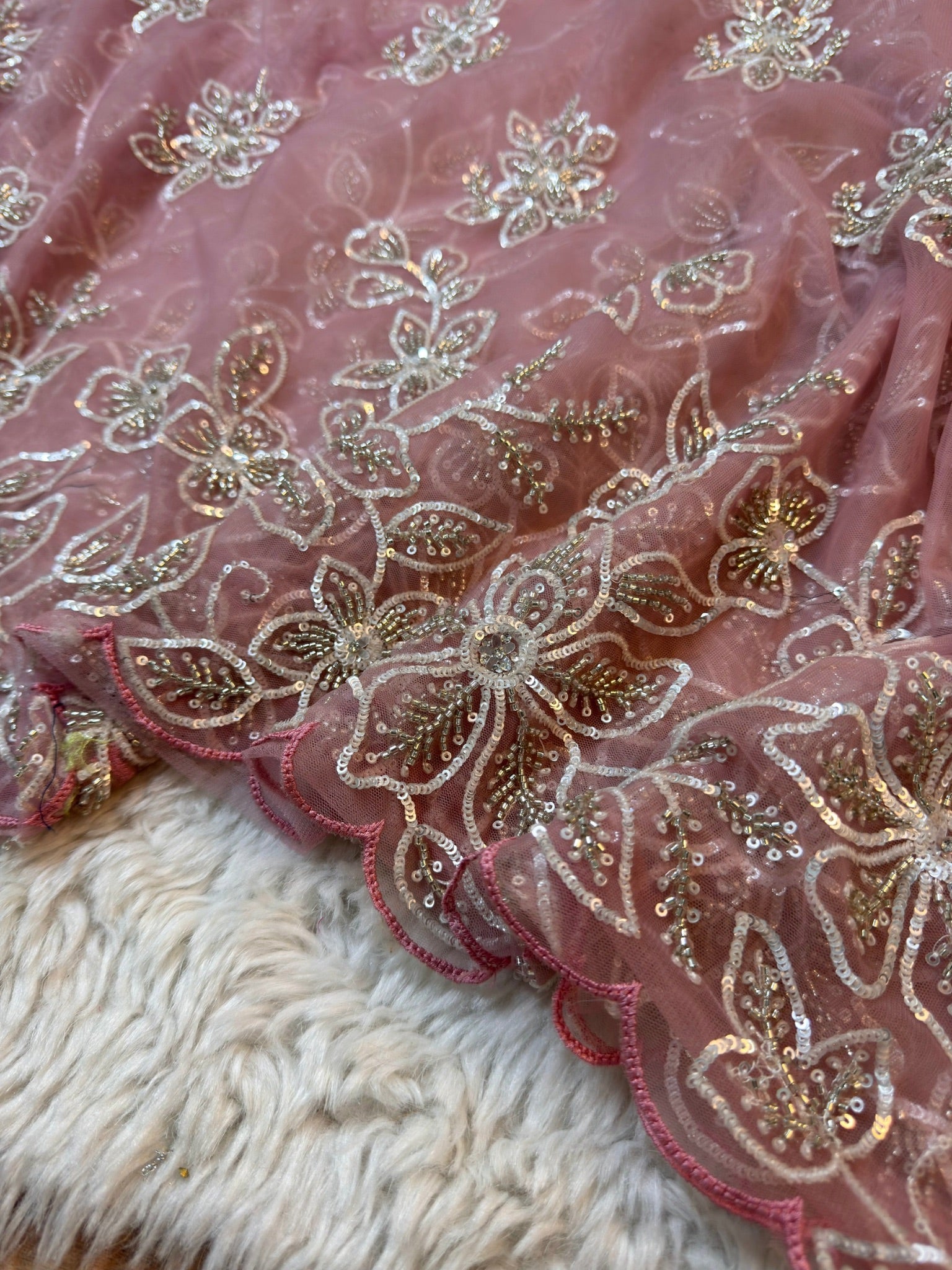 Designer Net Saree with Heavy Floral Sequin Embroidery & Scalloped Border