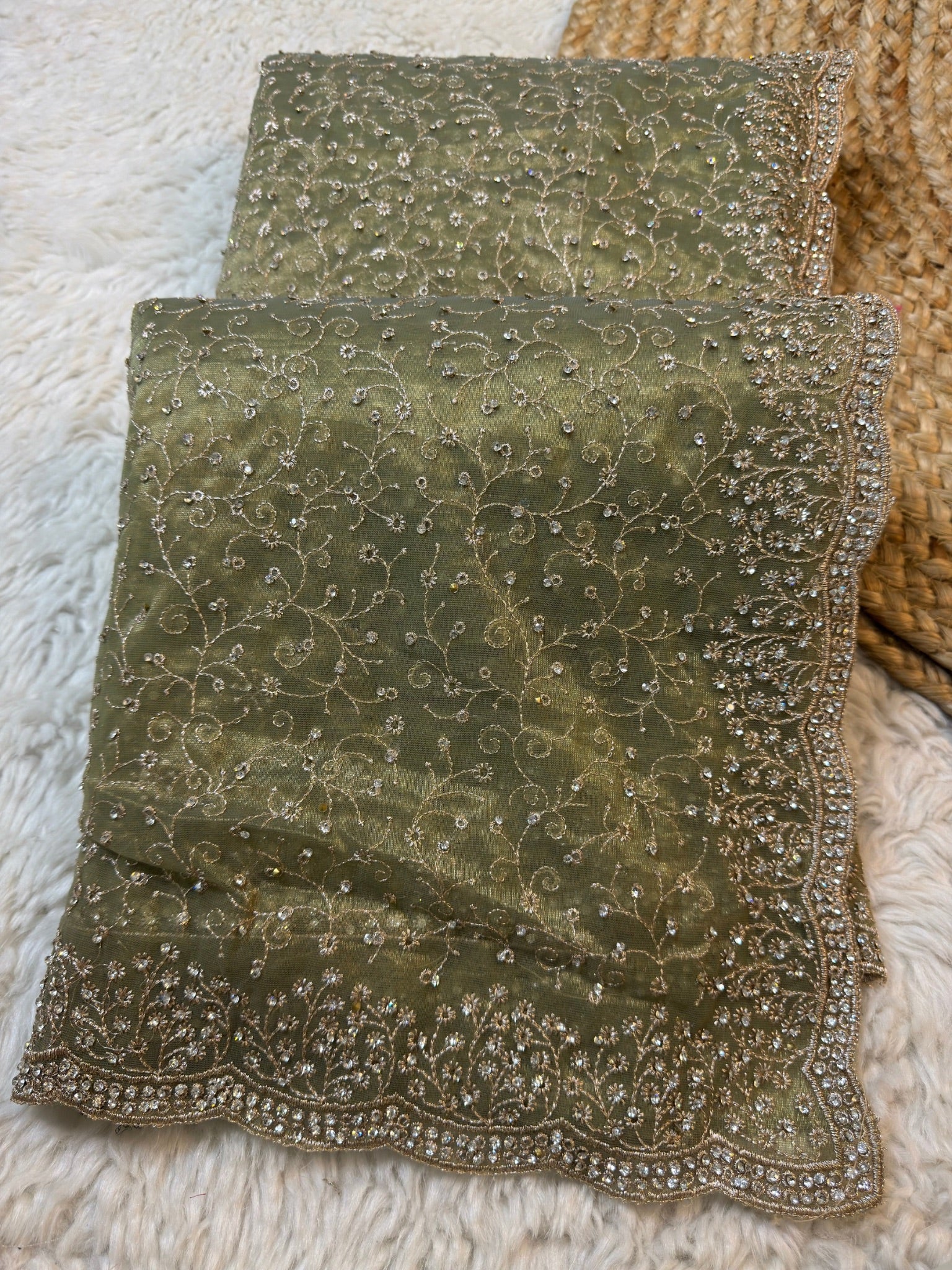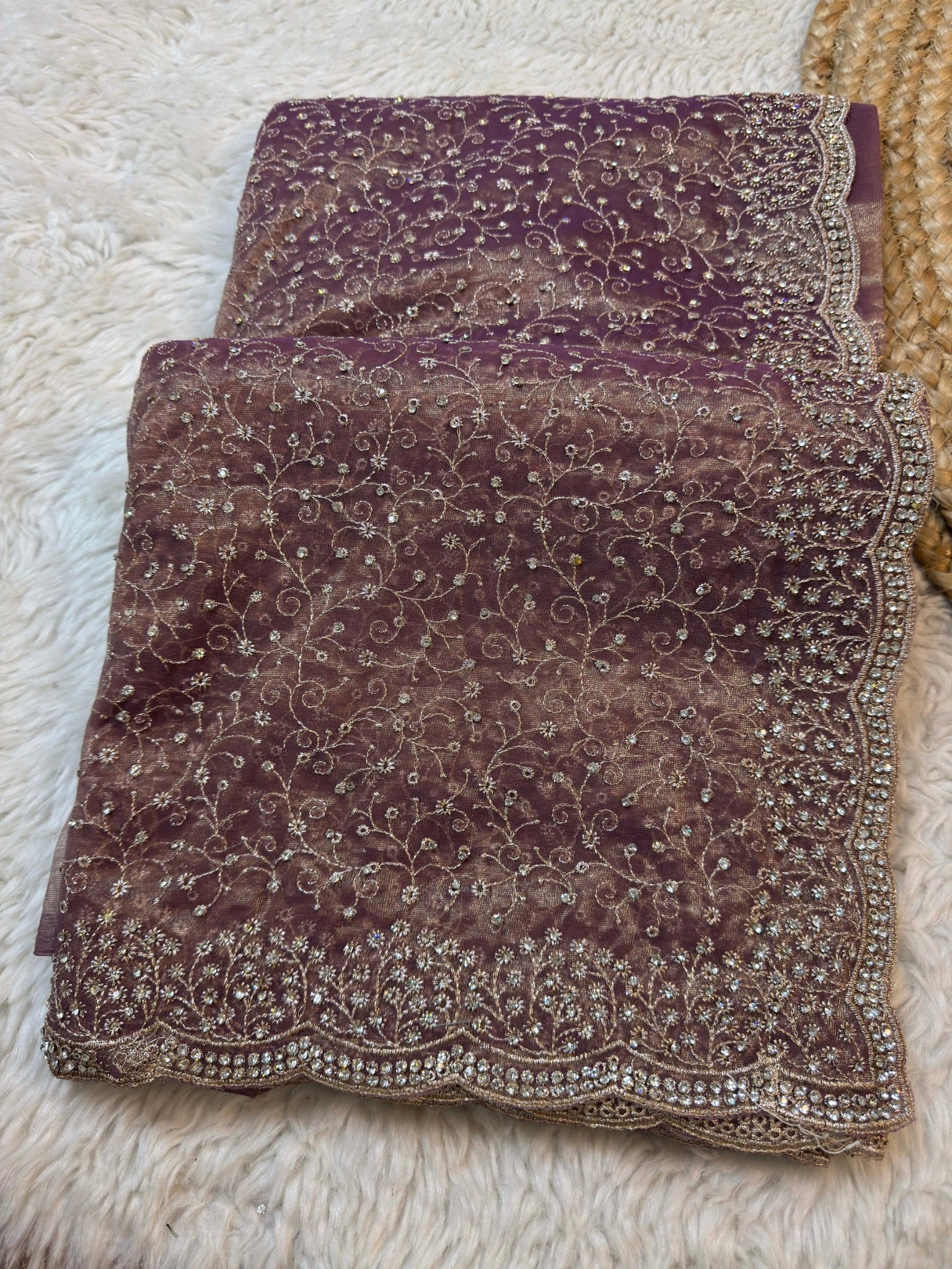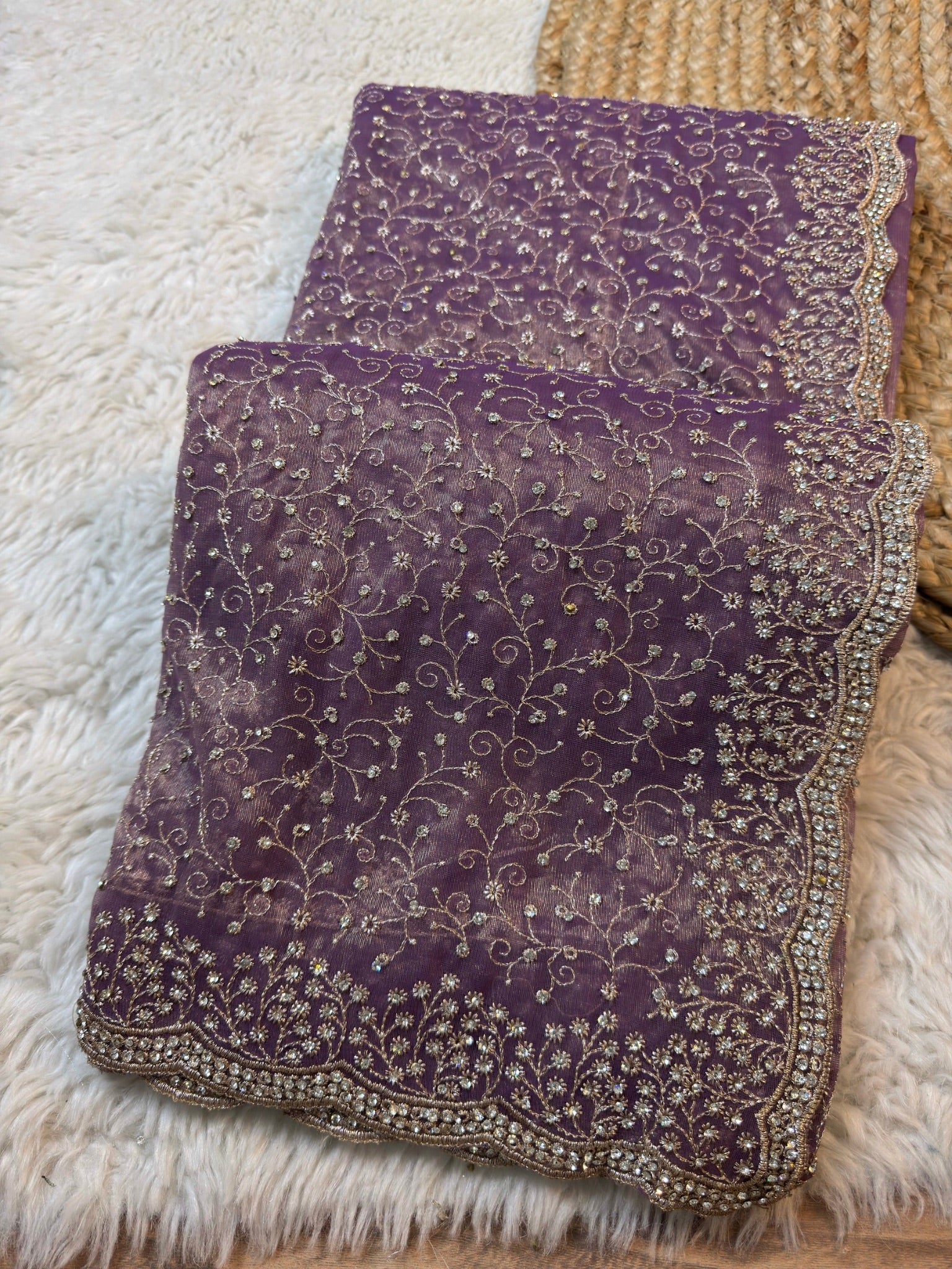 Twill Net Saree with Heavy Floral Sequin Embroidery & Scalloped Border