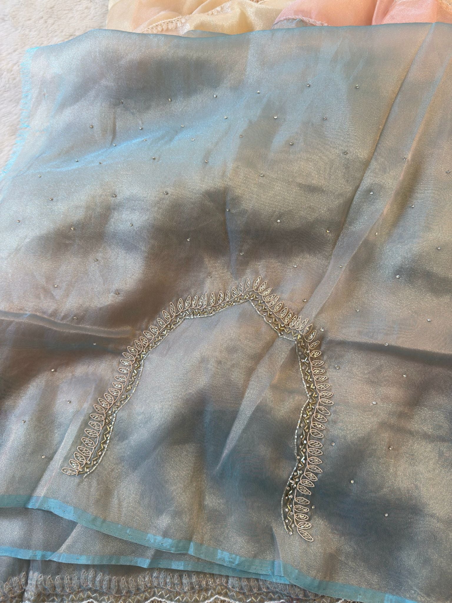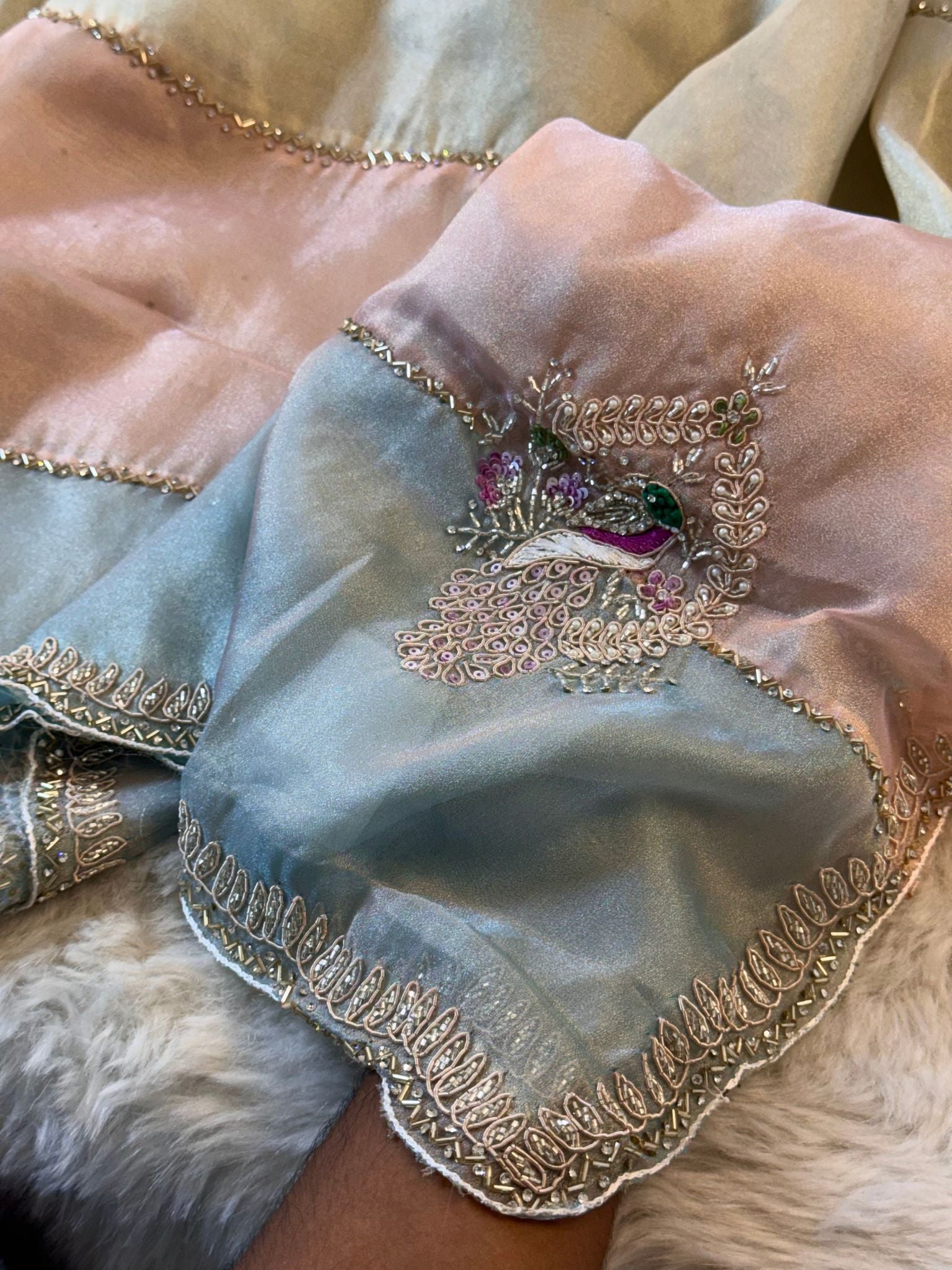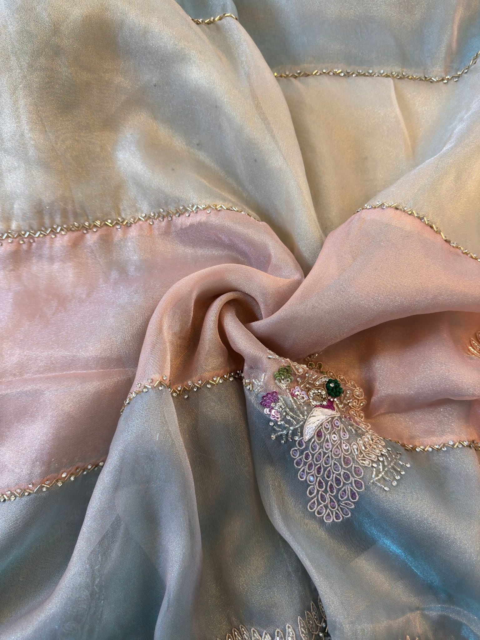 Radiate timeless elegance in this dual-tone tissue silk saree, gracefully blending soft silver-grey and peach hues with a lustrous sheen. The saree features a stunning handcrafted peacock motif, intricately done in zardosi, cutdana, and sequin work, making it a true piece of art.