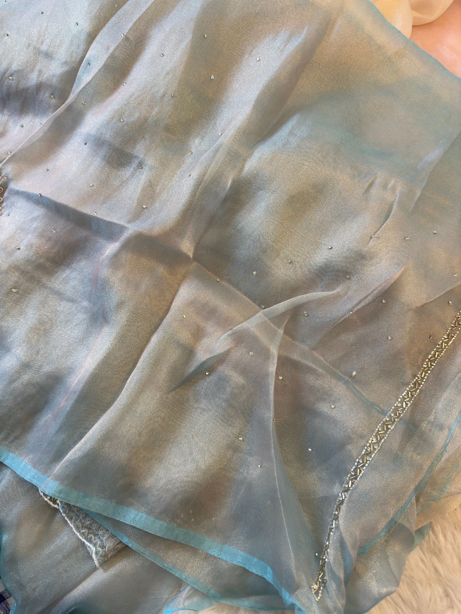 The delicate scalloped border with zardosi highlights adds a royal touch, while the lightweight shimmer tissue fabric gives it a graceful flow. Perfect for festive celebrations, receptions, and elegant day events, this saree captures luxury in every drape.