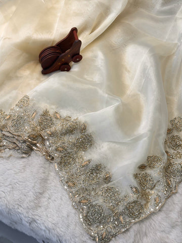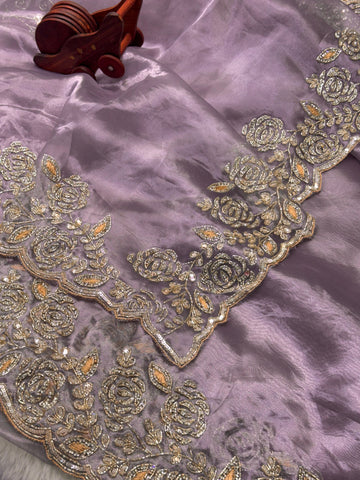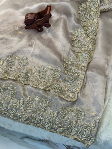✨ Mausam Tissue Saree with 3D Rose Motif Sequin & Zari Embroidery