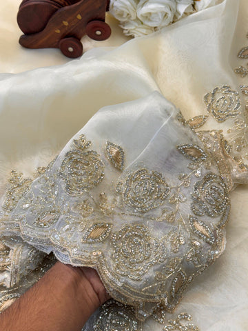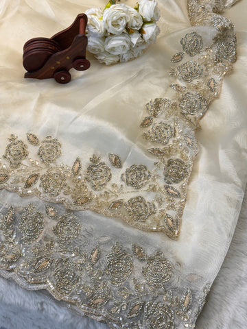 Turn heads this festive season with our Mausam Tissue Rose Border Saree Collection – a delicate blend of shimmer, structure, and embroidery. Crafted in lightweight Mausam tissue, this saree showcases floral rose motifs intricately detailed with sequins, zari threads, and hand embellishments along the scalloped border. The semi-sheer fabric lends an ethereal fall, while the luxurious border adds statement charm.