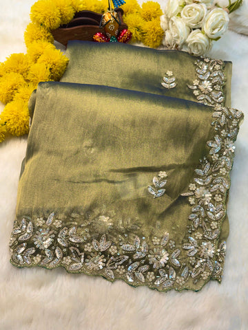 Olive Green Zari Silk Saree with Heavy Embroidered Border