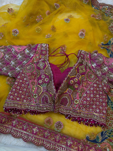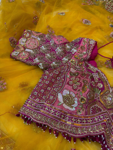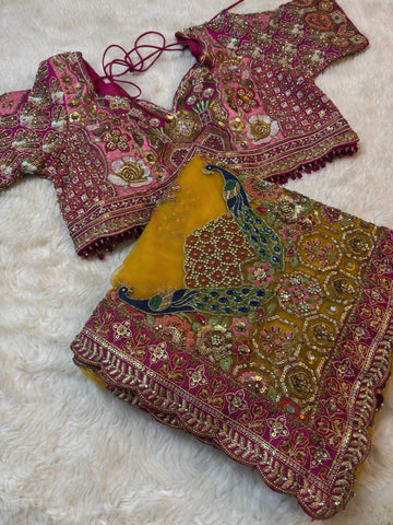 This premium net saree features exquisite heavy embroidery with multicolour floral and peacock motifs, highlighted with sequins, stones, and intricate handwork. The saree is paired with a richly embroidered designer stitched blouse, making it a complete statement ensemble.